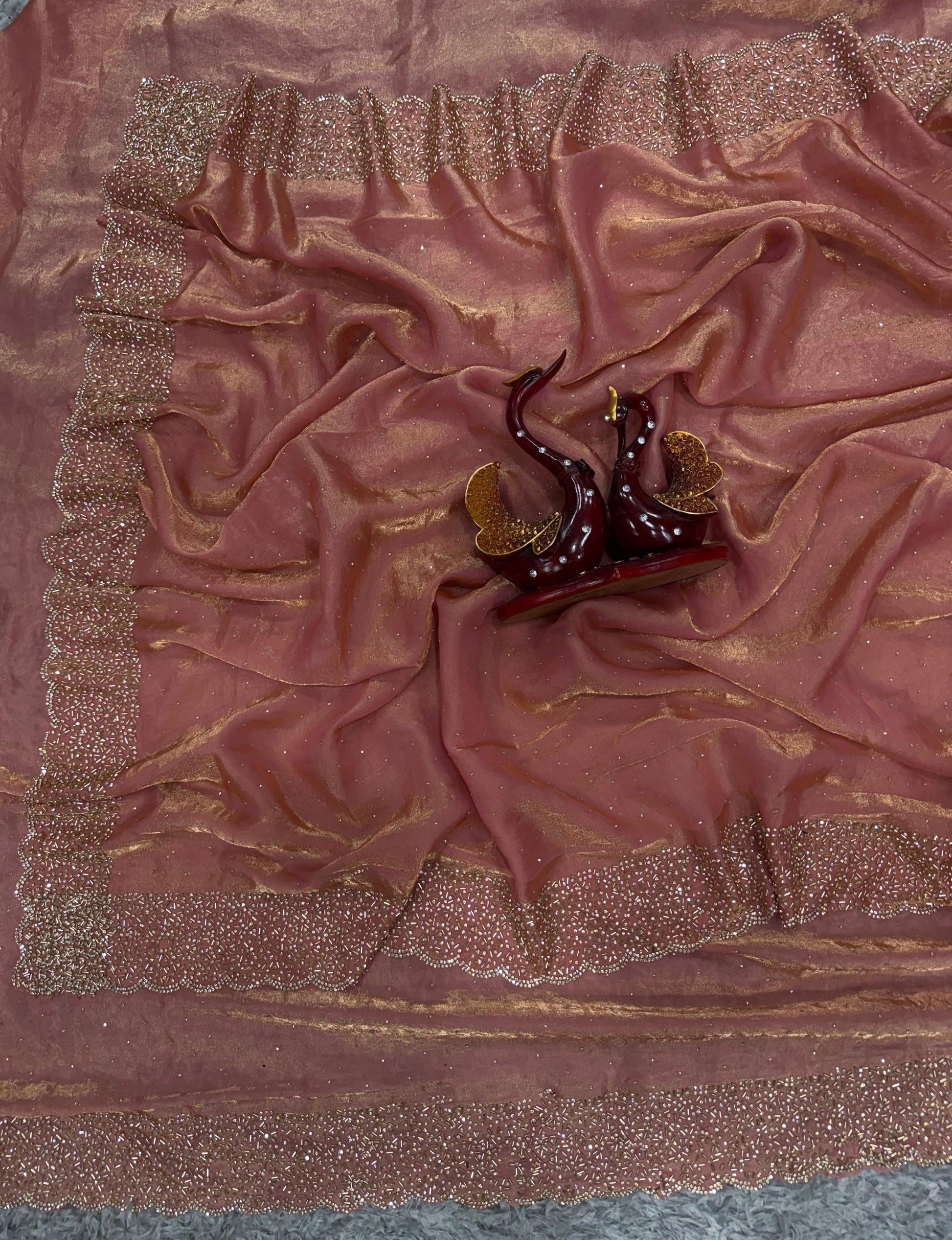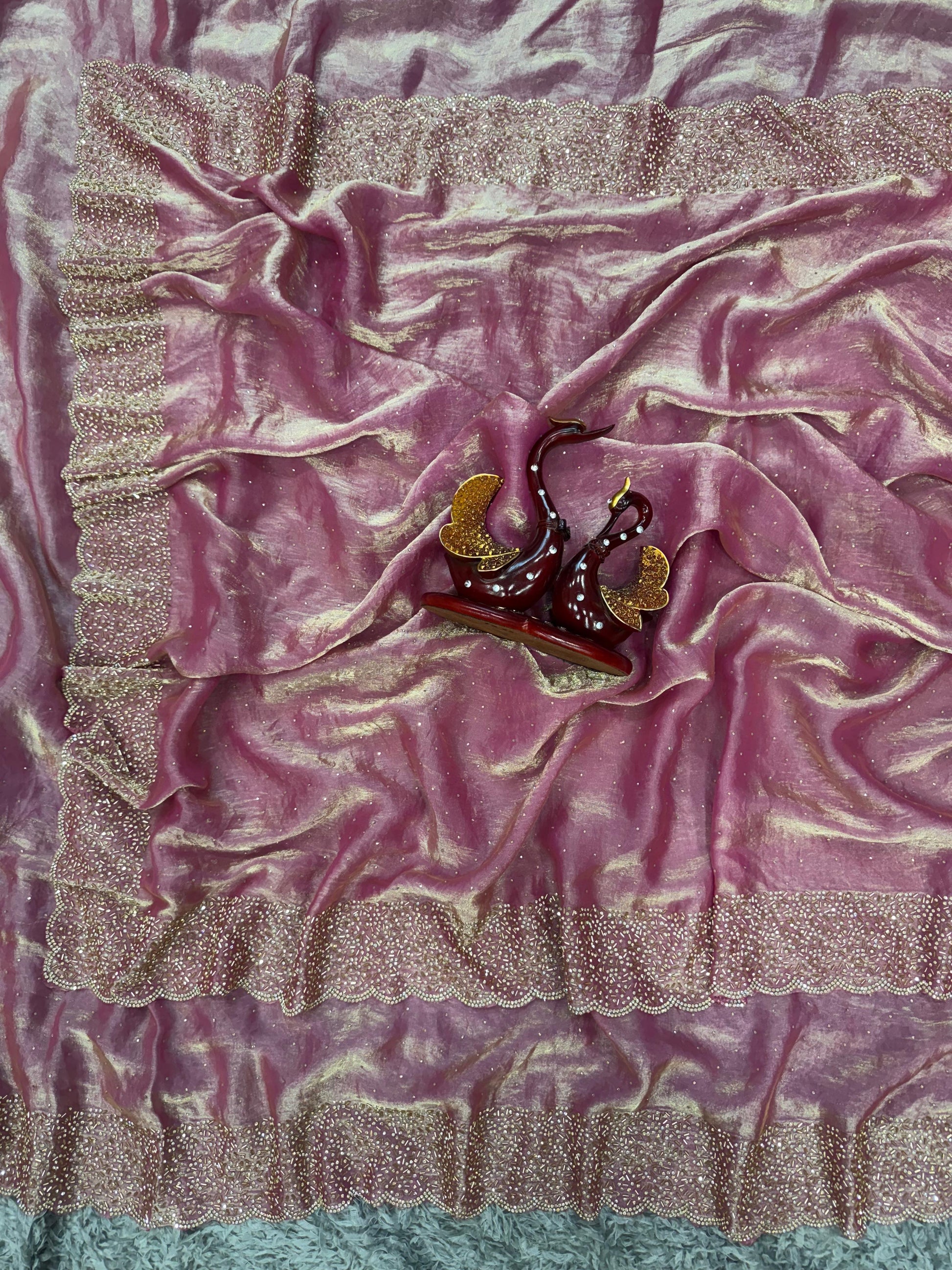 Elevate your style with the Aashvi shimmer Saree. Made with premium Space Silk, its original Jarkhan Diamond work adds a touch of luxury to any occasion. The beautiful Diamond work on the blouse complements the pink silk saree, bringing out its vibrant charm. Make a statement with this exquisite piece.
