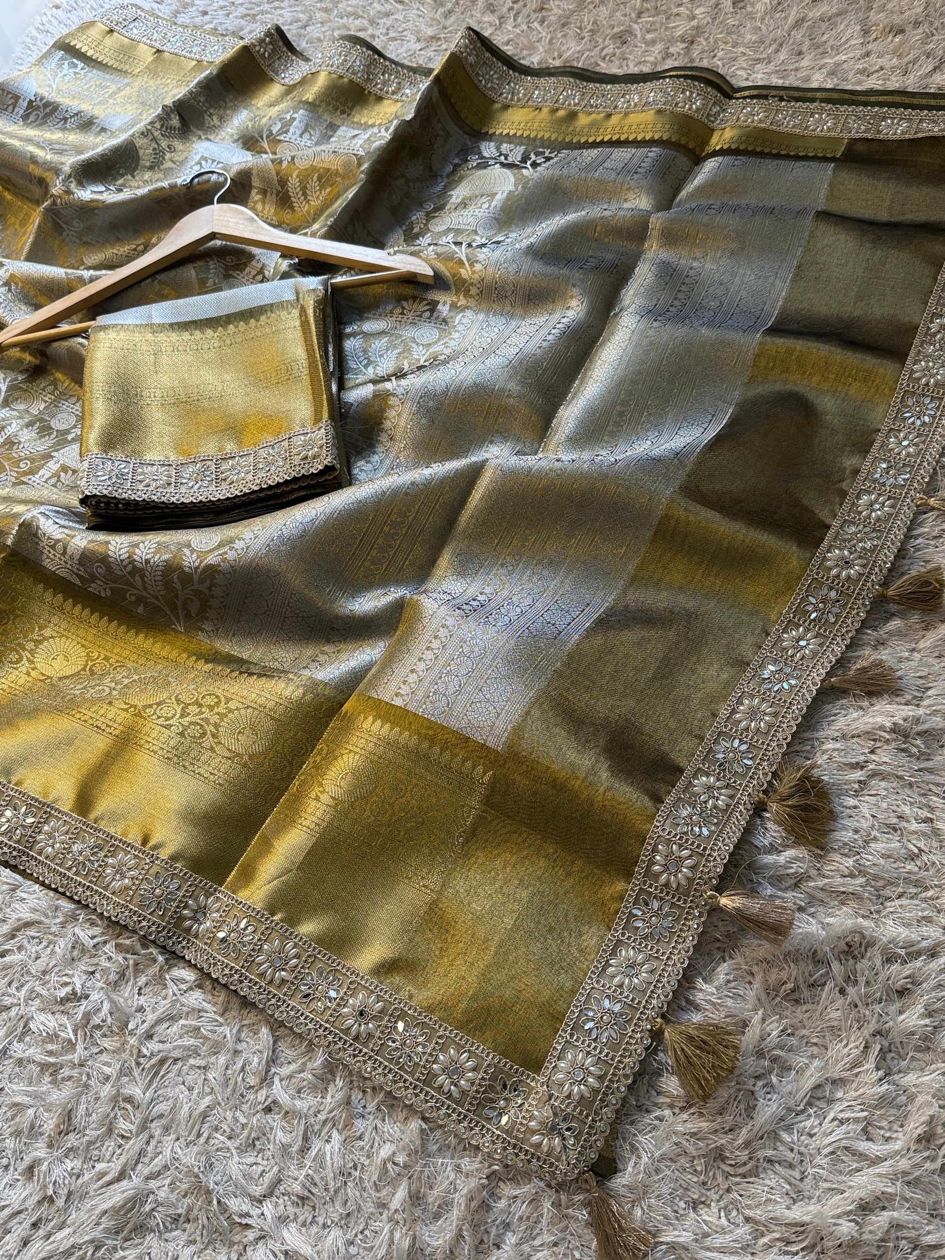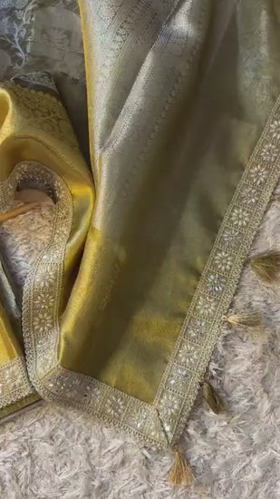 The Aura of Gold Saree features a Banarasi Kanjivaram design with a luxurious big border crafted from katan tissue silk. The saree is adorned with a handcrafted lace border and a stunning brocade body, combining traditional craftsmanship with elegance. Ideal for bridal wear, it represents a unique addition to any wardrobe.