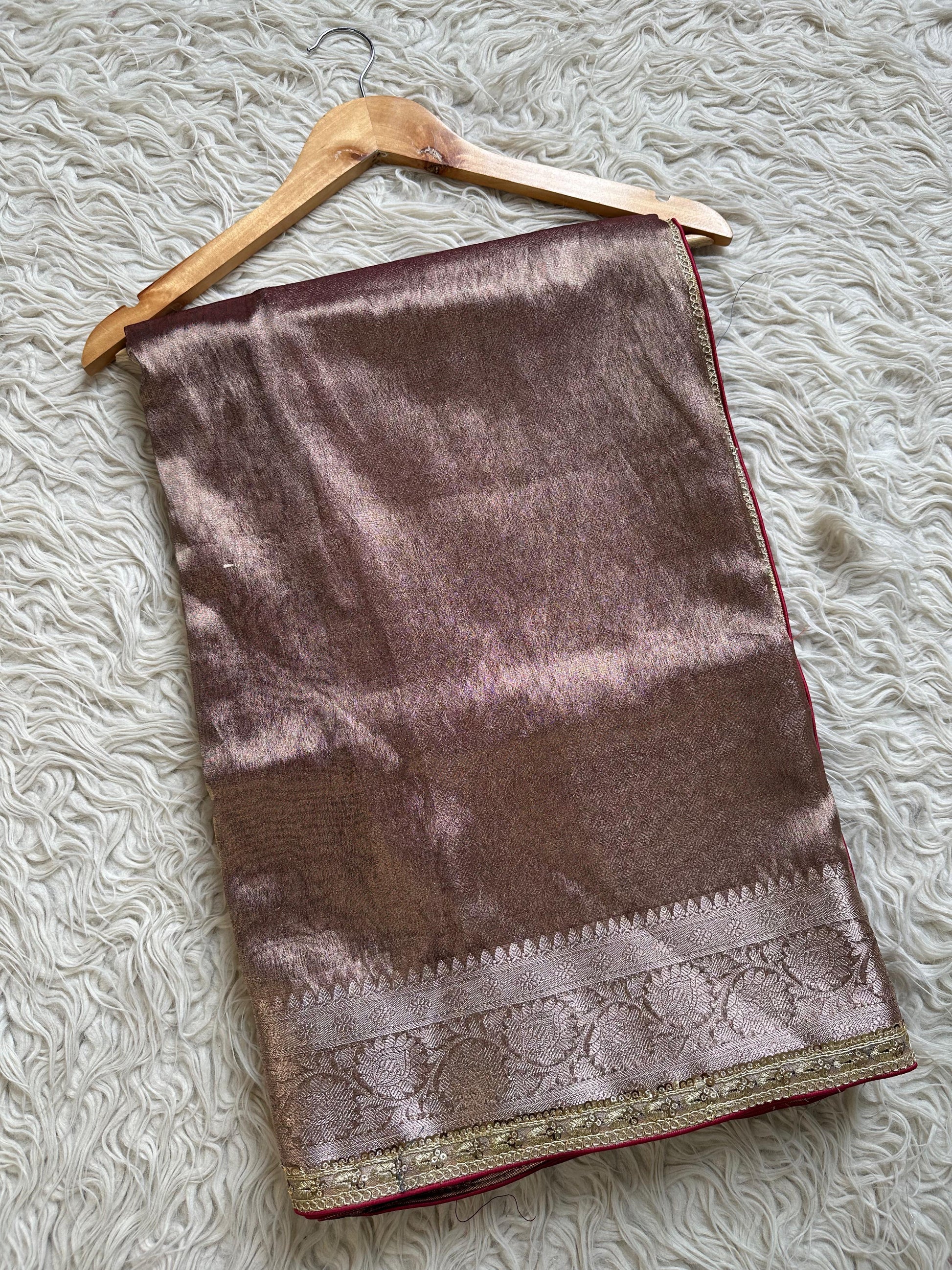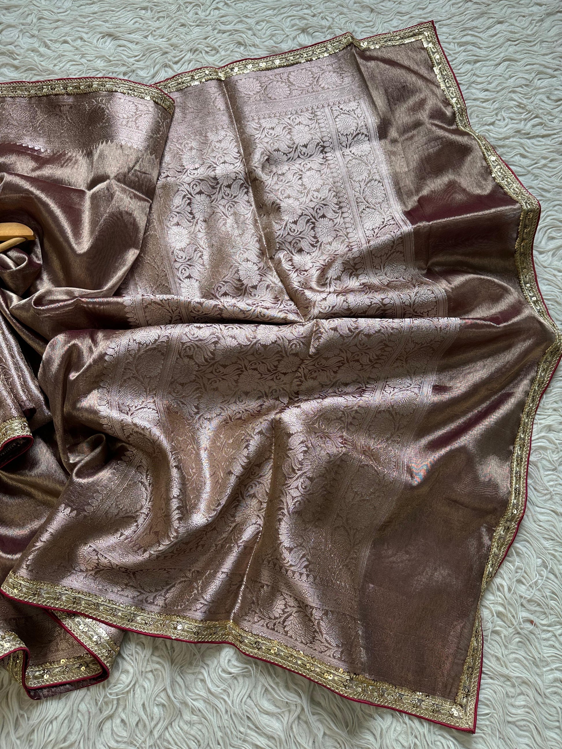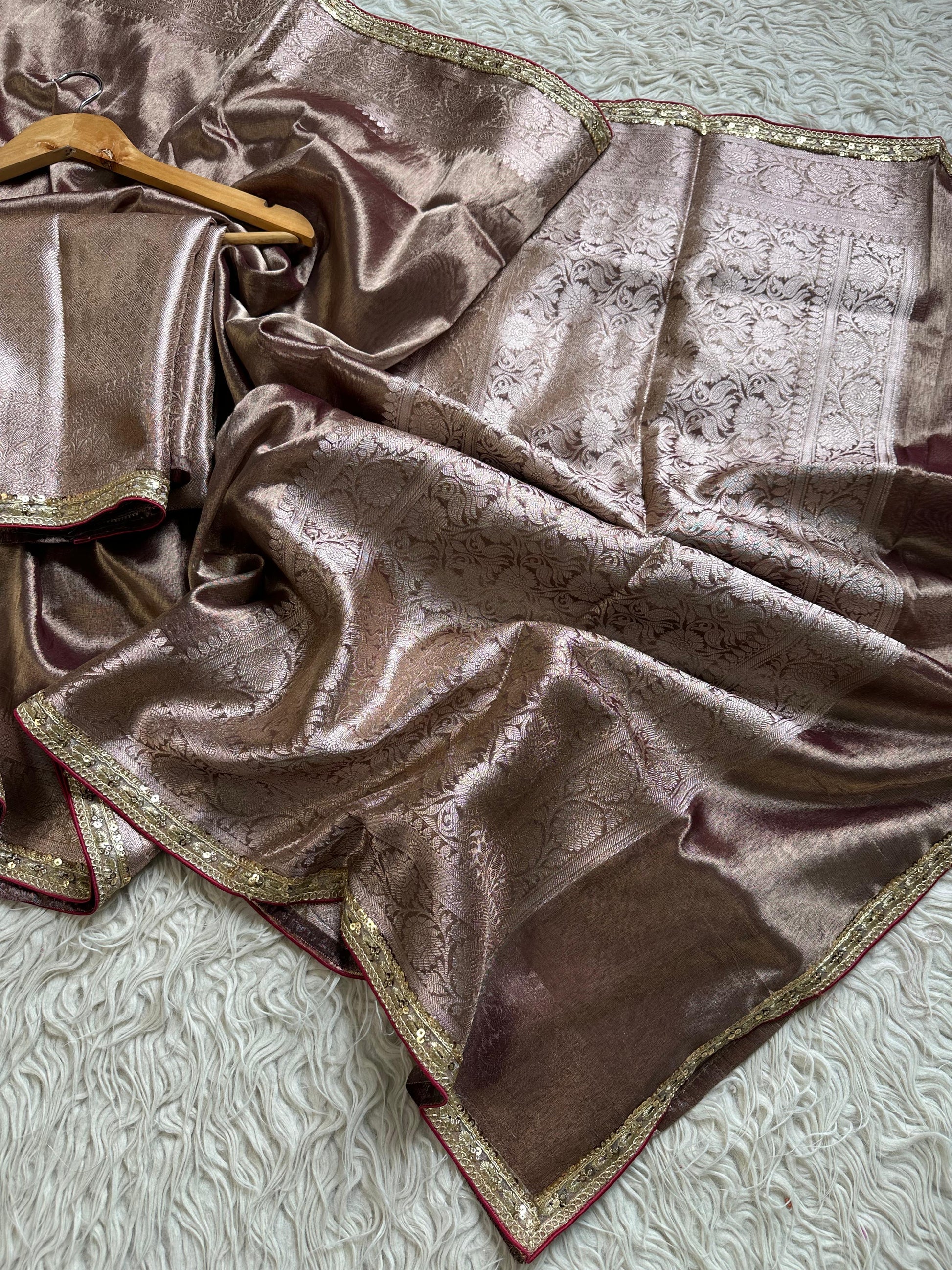 Introduce a touch of luxury to your wardrobe with our Bronze Elegance Saree. This authentic tissue Banarasi saree is inspired by the iconic Shobita, known for her exquisite fashion sense. Adorned with gold zari weaving and a beautiful lace border, its rich jacquard lace pallu adds a sophisticated touch. Comes with a premium quality blouse piece.
