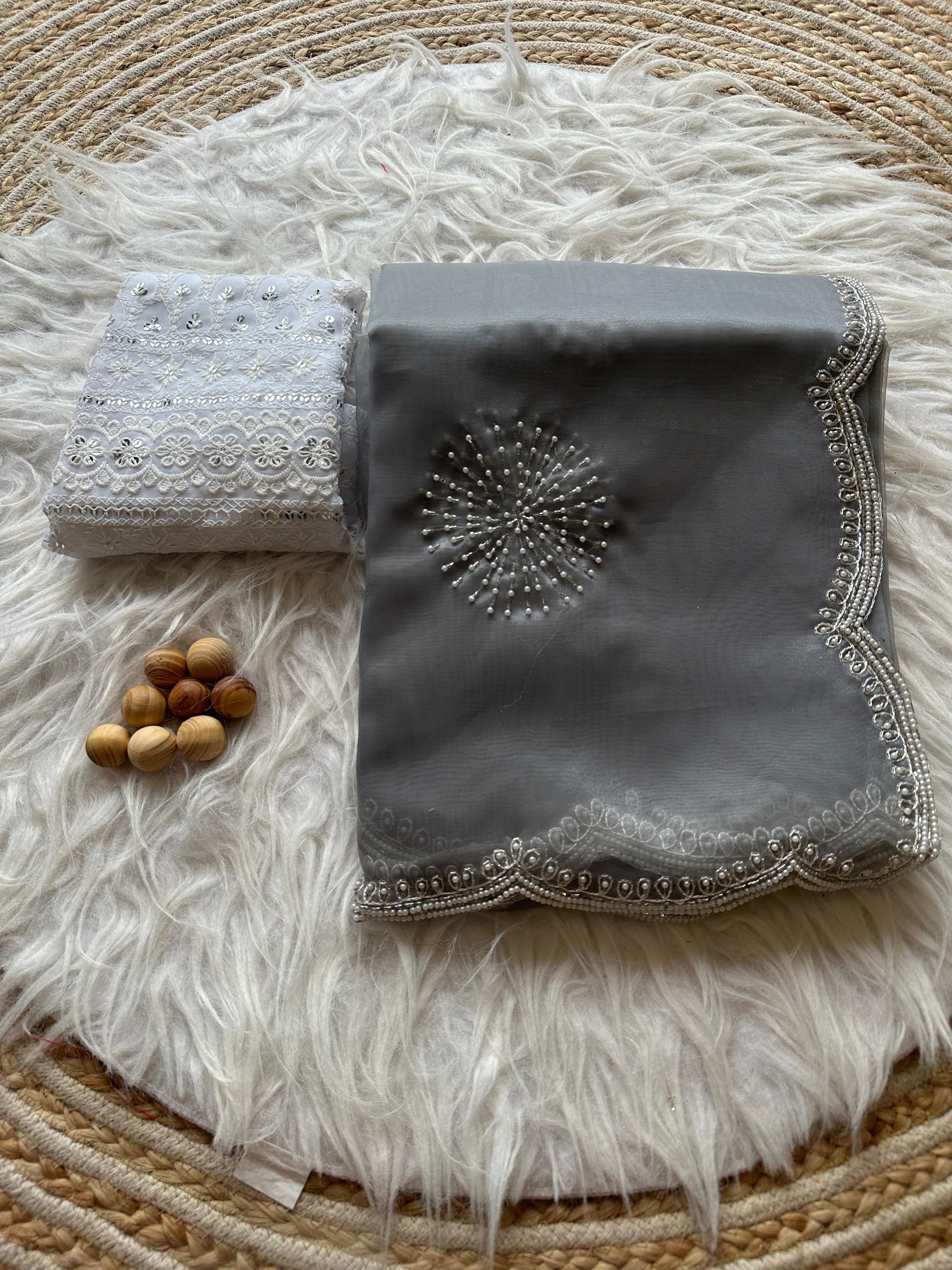 Upgrade your wardrobe with our Carol Handwork Saree in Grey. Made from pure organza, this saree features a beautiful cutwork border and fully handworked pearls for a touch of elegance. The blouse, made from georgette fabric, is adorned with chikankari work. Perfect for any occasion, all work is done by hand for a truly unique piece.