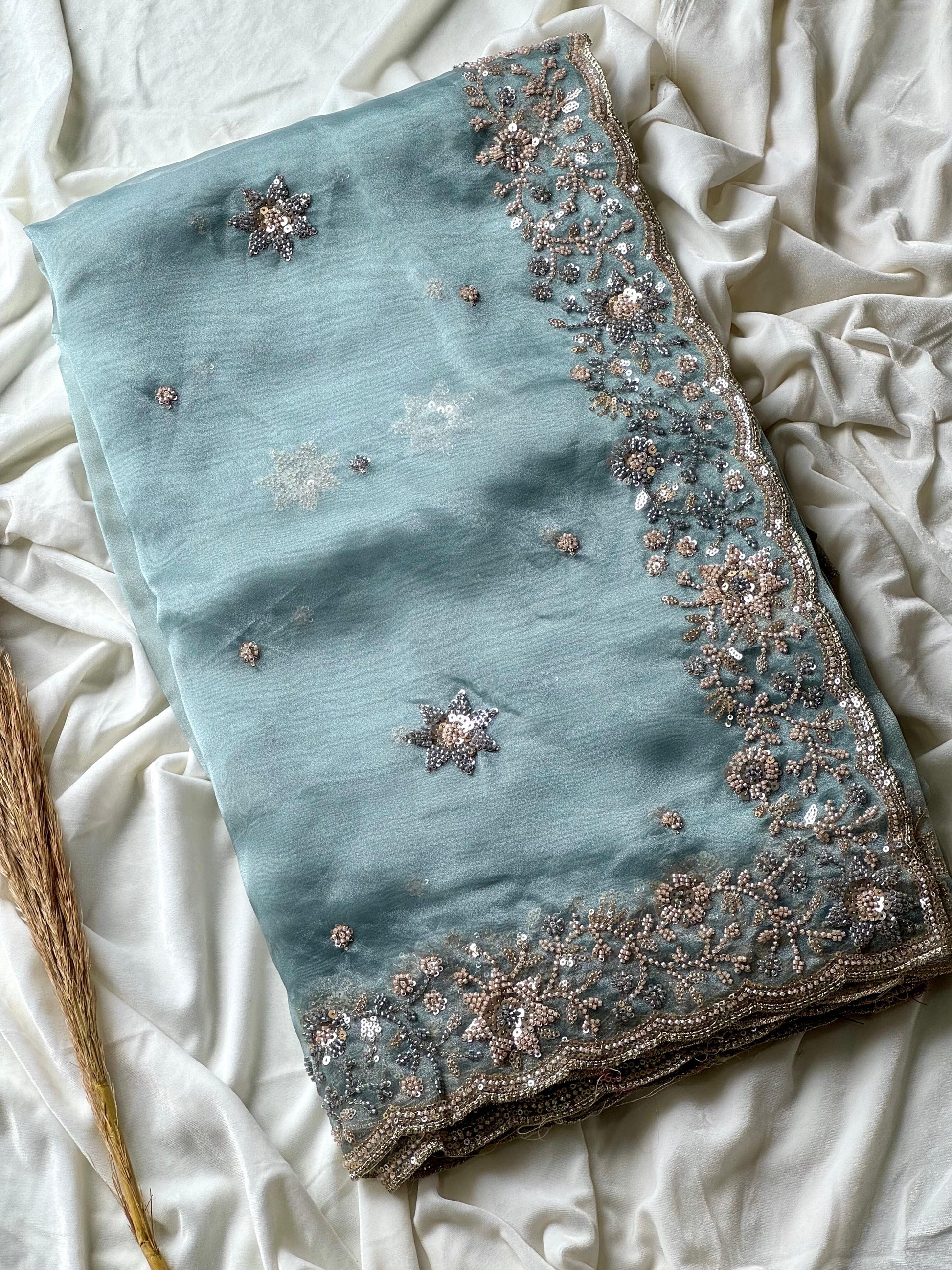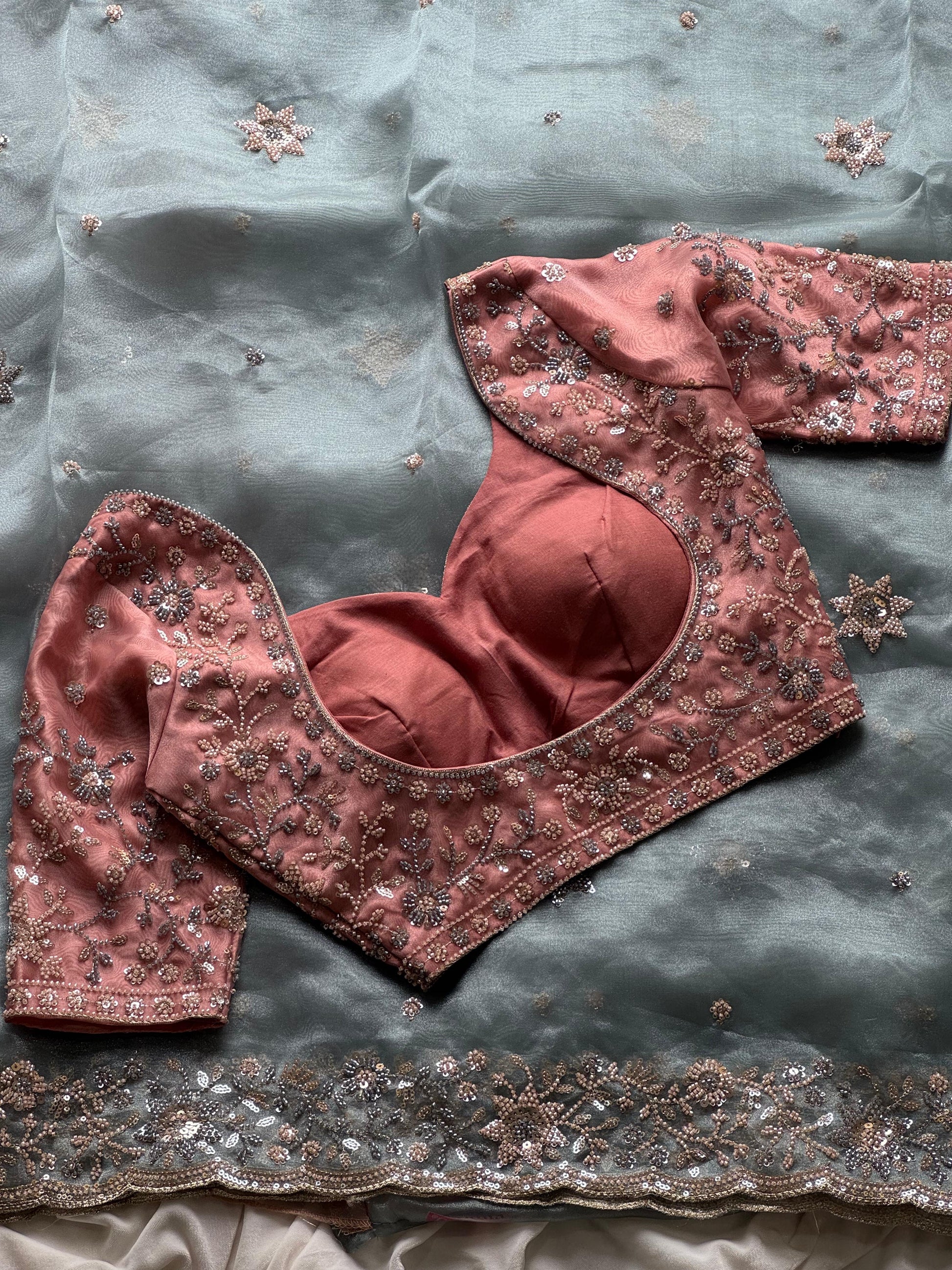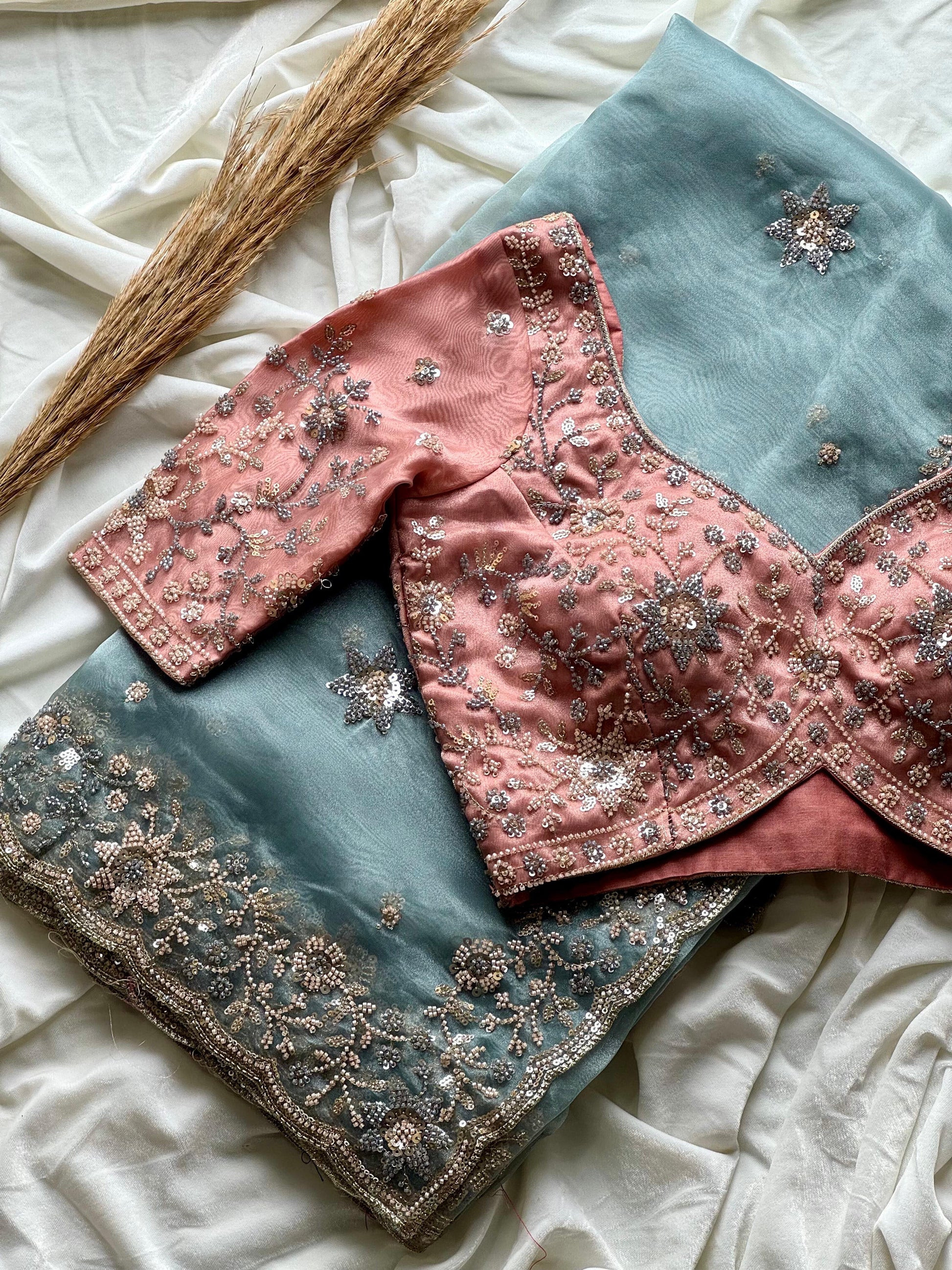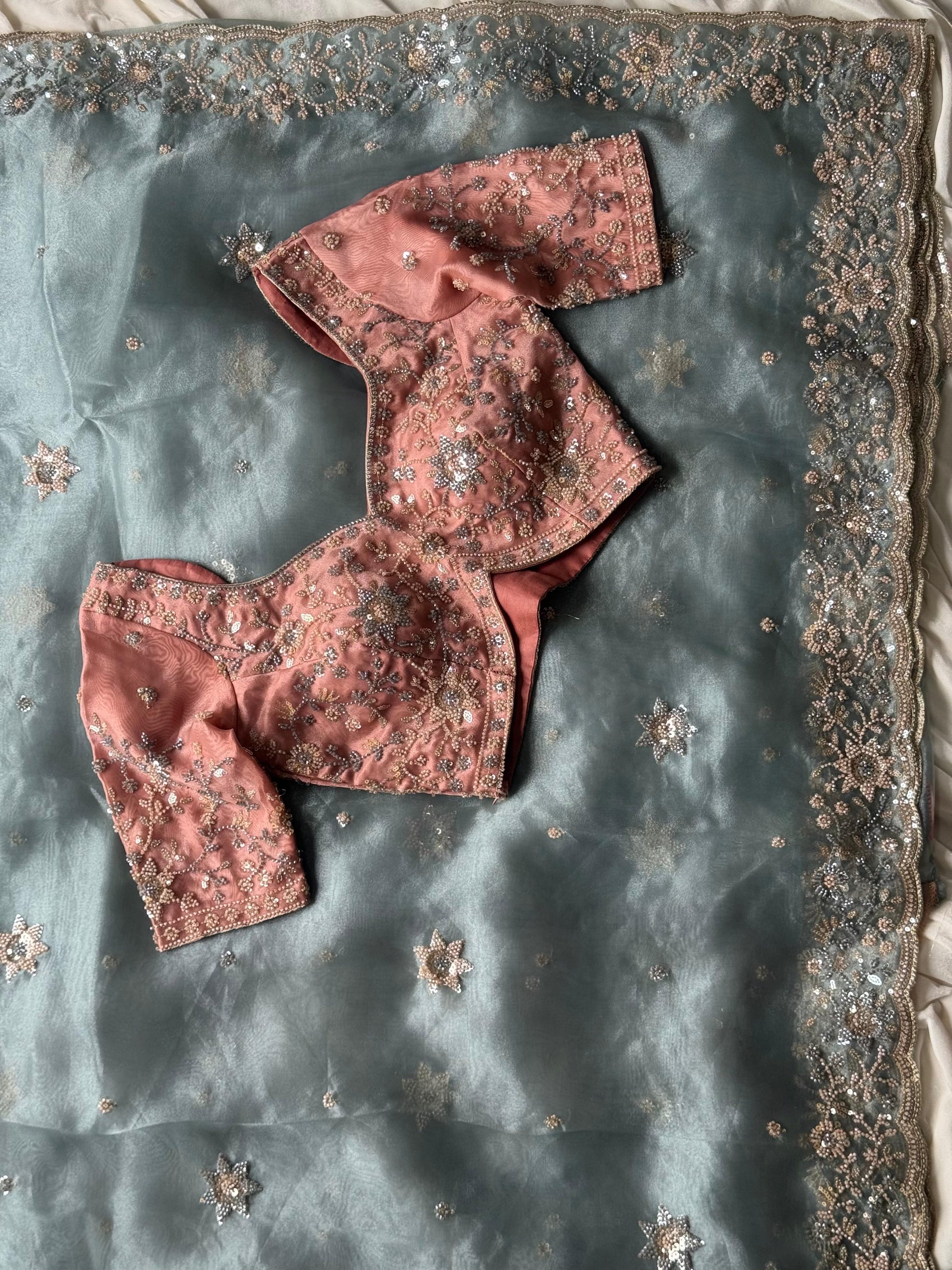 Introducing our latest arrival, the Coral Mist Saree. Made from the softest organza crepe silk, this saree features exclusive handwork with intricate pearl and cutdana details. A true representation of finesse and elegance, this saree is a must-have for any sophisticated collection.