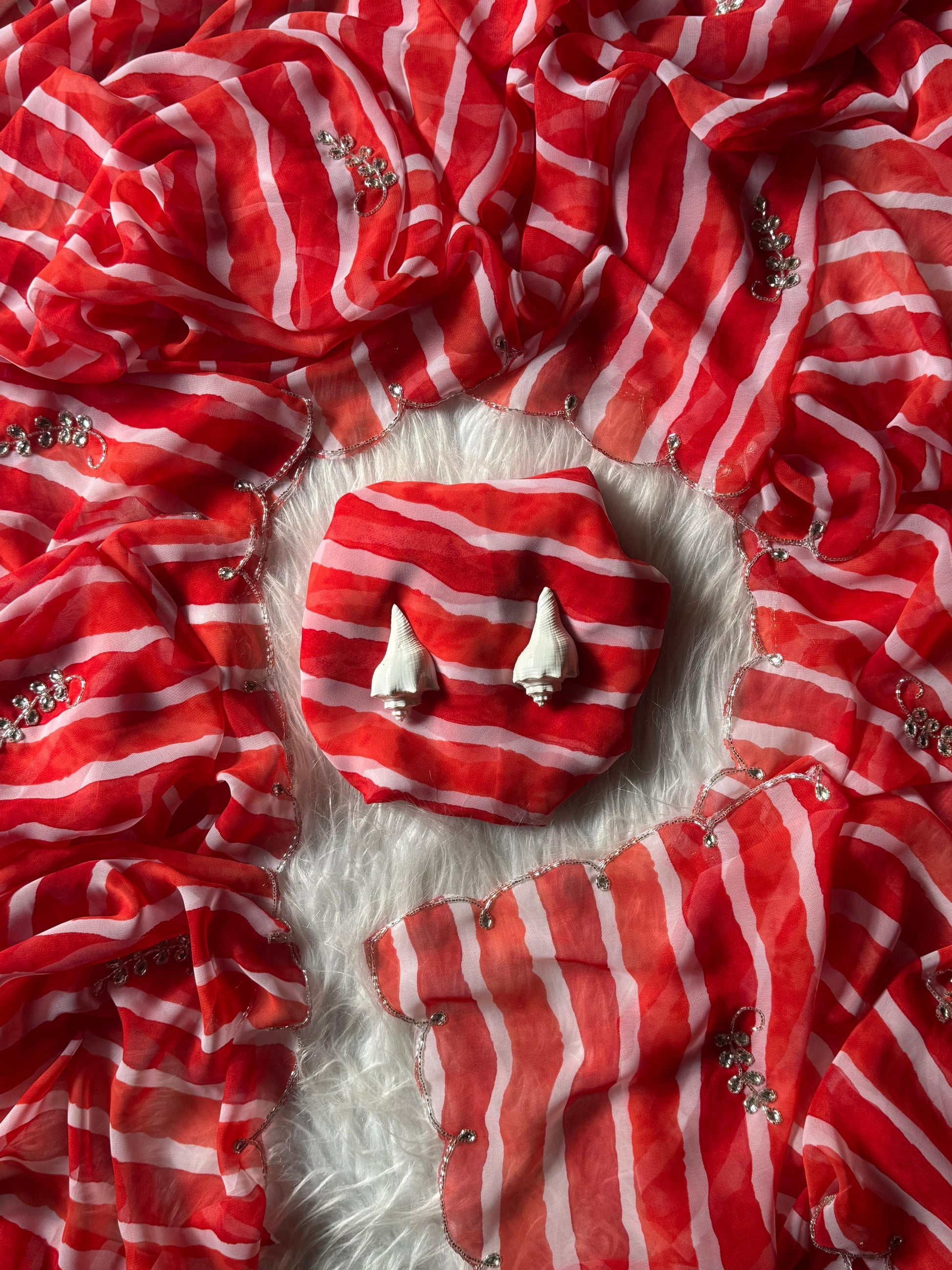 Experience luxury and elegance with our Soft Georgette Fabric with Leriya Print. The cool print, Cutdana handwork, and diamond work add a touch of sophistication. The border cut work and all over cut dana butta elevate the design. Made with export quality materials, this 6.50 cut saree comes with a running blouse.