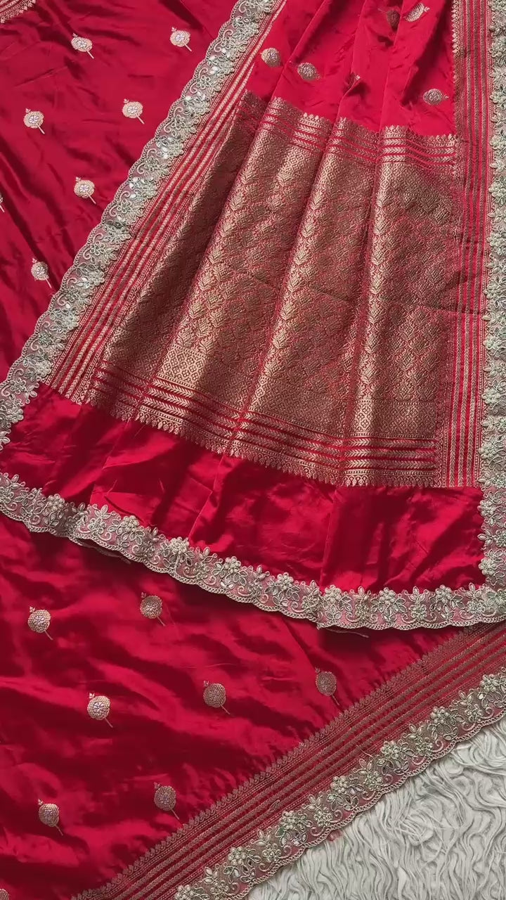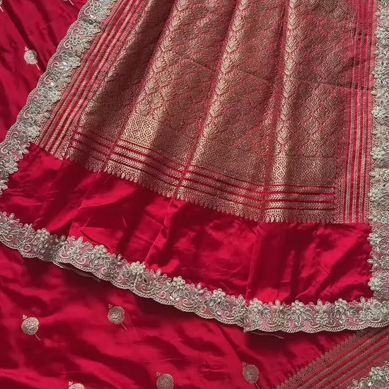Experience elegance and luxury with our Devyani Vermilion Saree. Made of authentic Banarasi premium mashru silk, this saree features beautiful gold Zari weaving and a diamond lace border. The body boasts a stunning buta weaving, while the pallu is adorned with a rich jaquerd diamond lace. Comes with a blouse piece and ensures a premium quality.