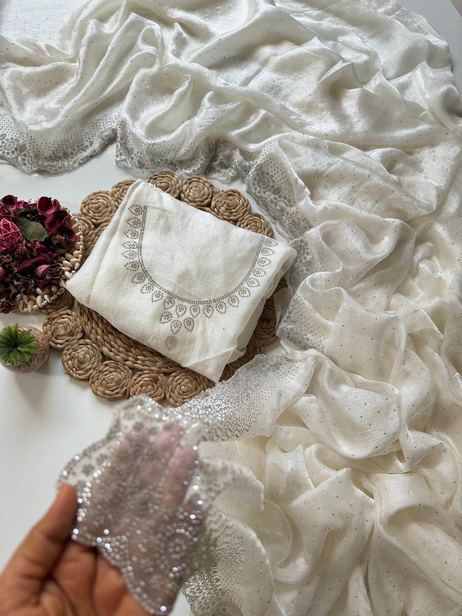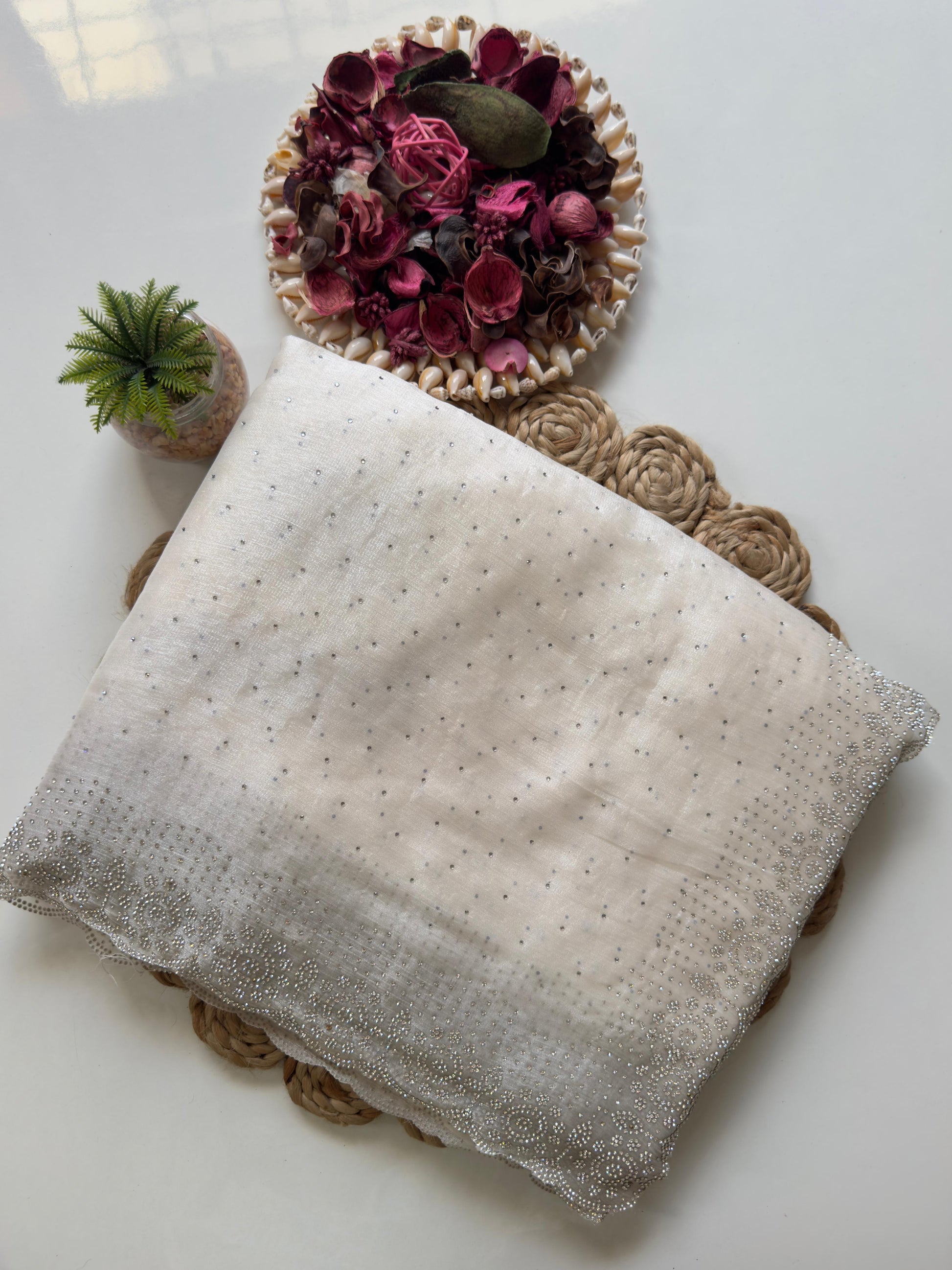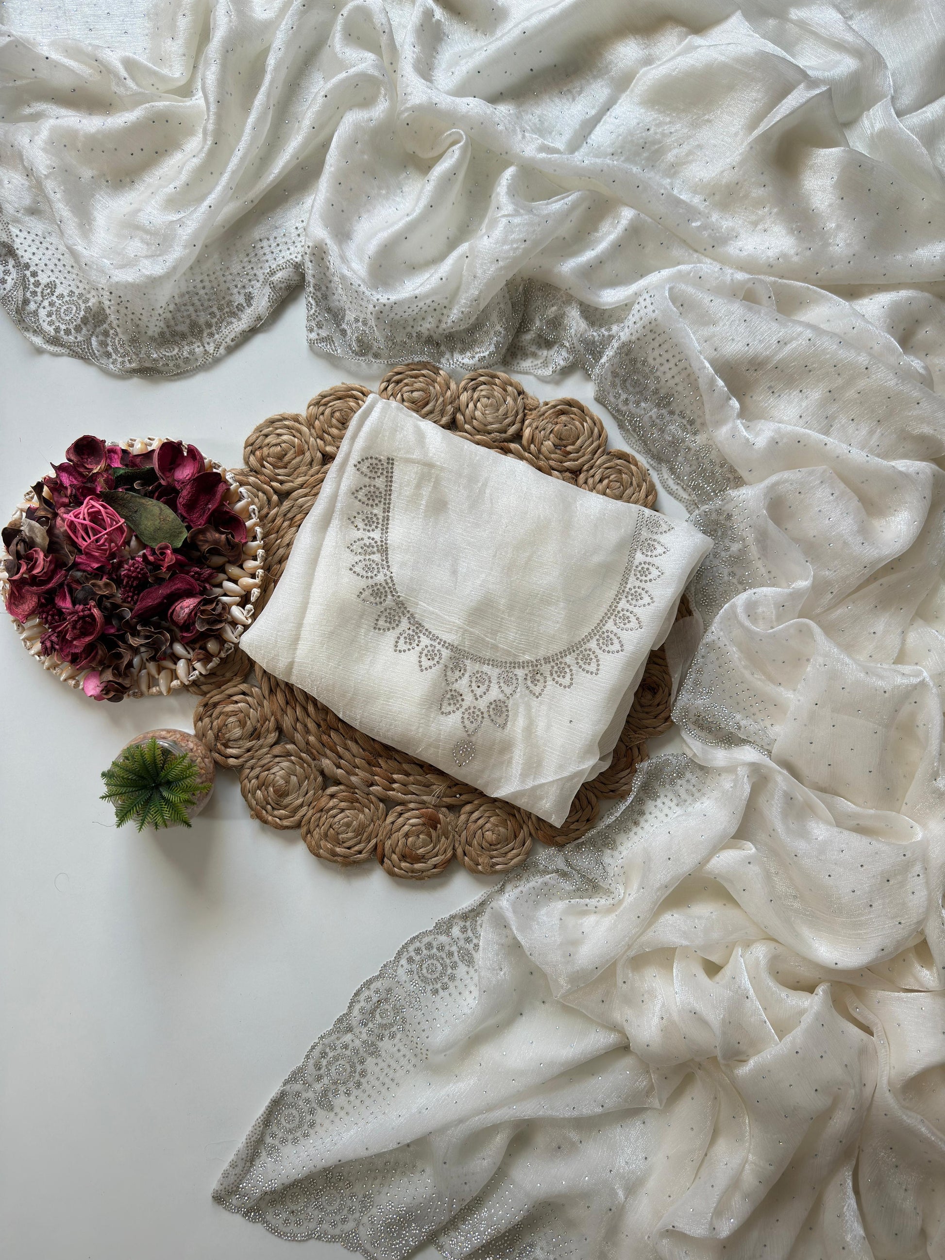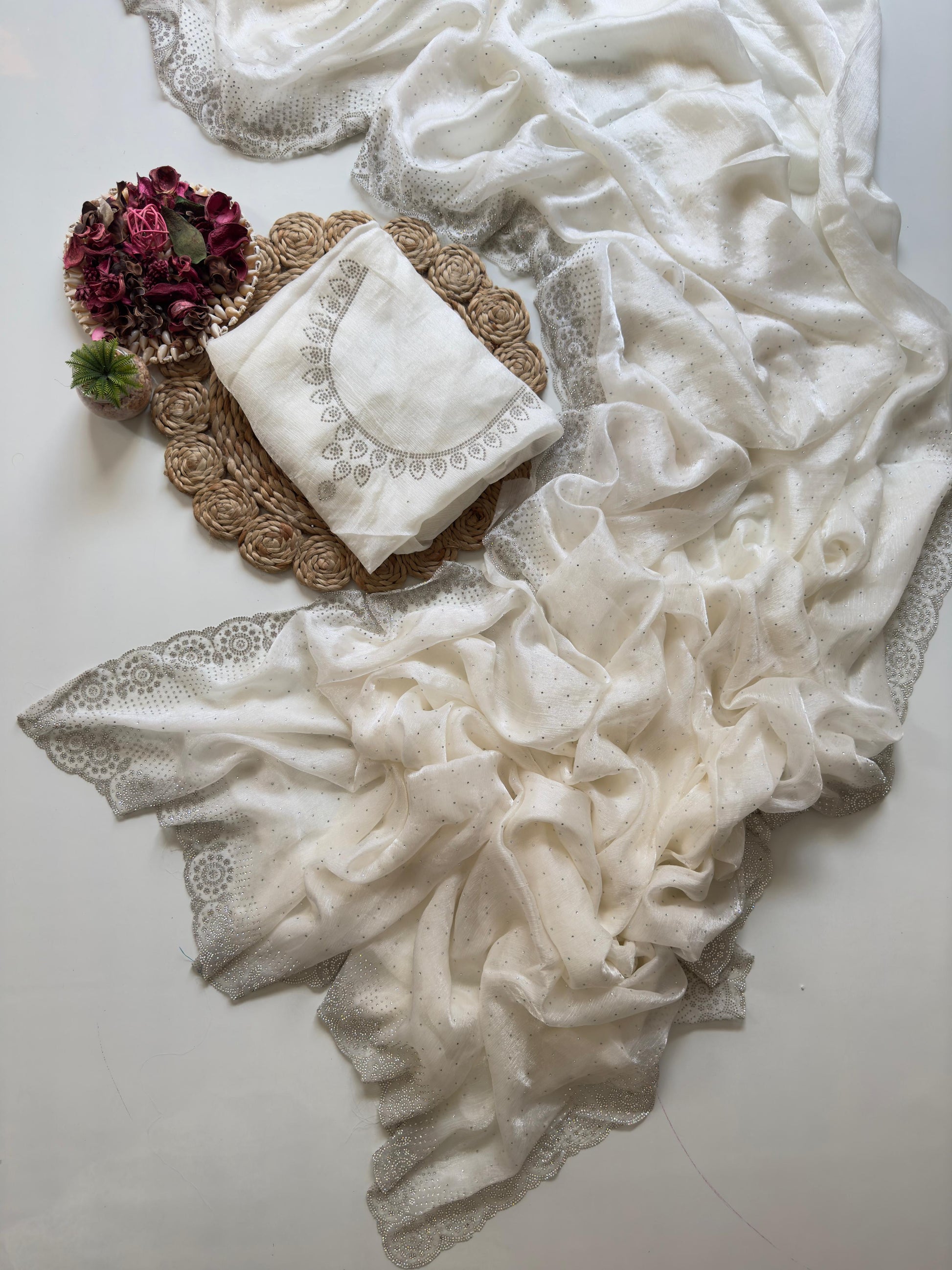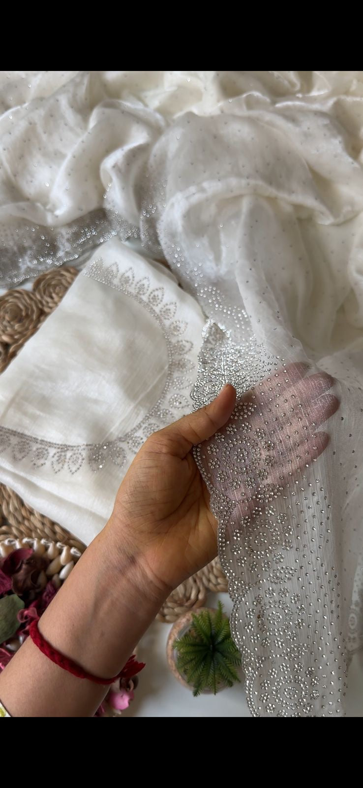 Indulge in luxury with our Diamond Mist Saree. Made from pure Burrbury silk, this exquisite piece features intricate glass sirvoski work and a delicate scalp border. Paired with a matching blouse of running Burrburry silk and a Jarkan neck pattern, this saree exudes sophistication and elegance. Elevate your style with this one-of-a-kind creation.