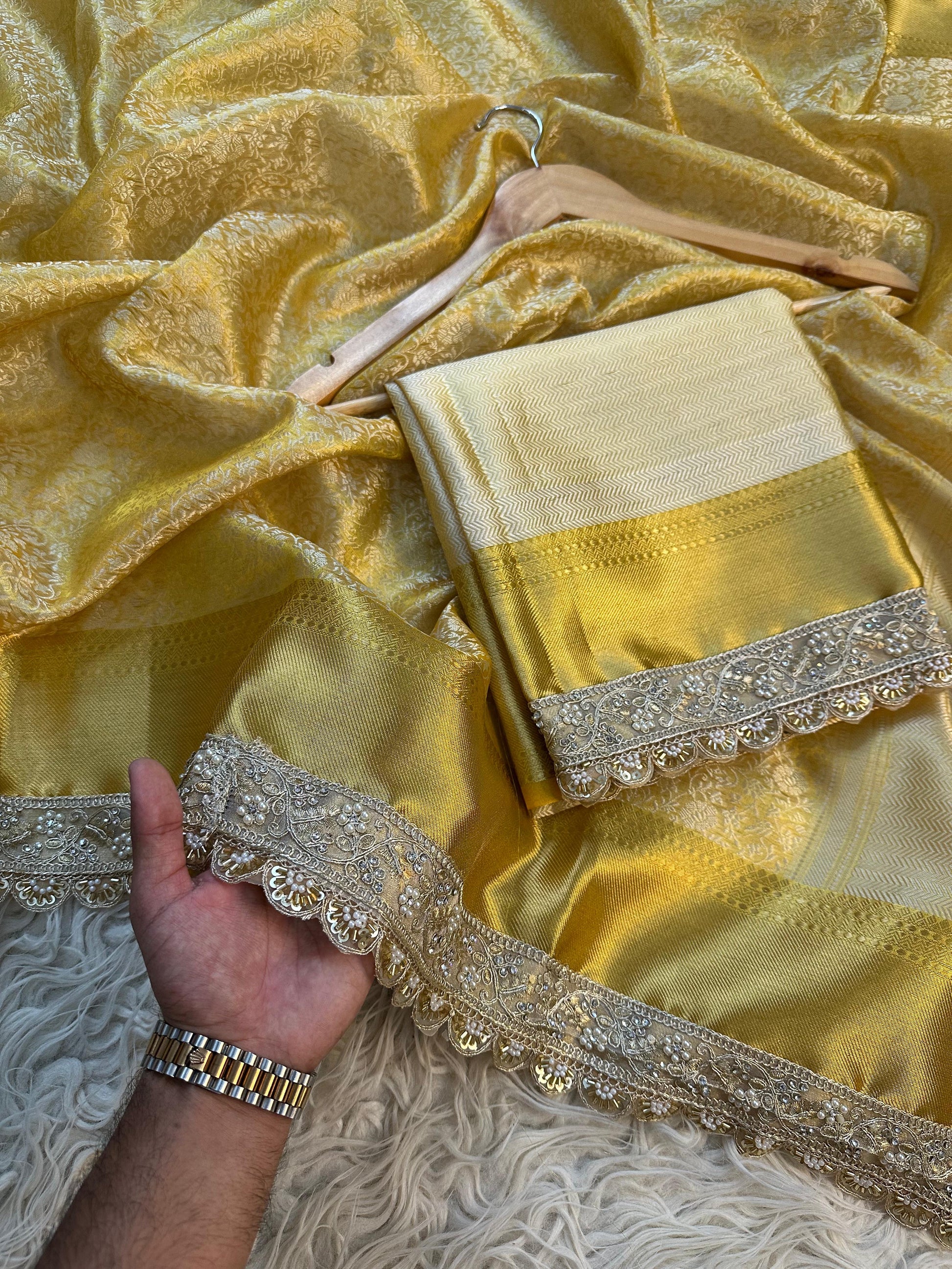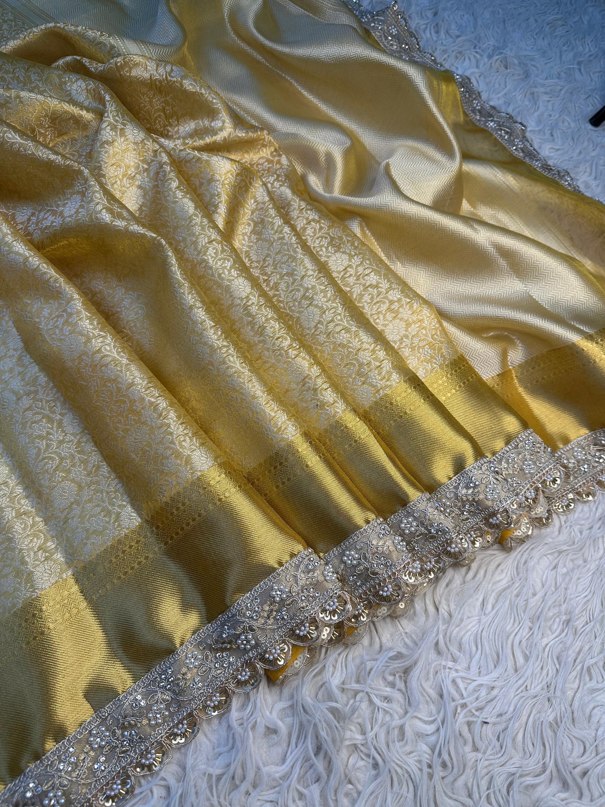 Introducing the Divine Glow Saree - a premium kanjivaram silk saree that will elevate your style to a whole new level. With intricate gold zari weaving and a beautiful lace attached border, this saree exudes elegance and grace. The rich lace attached pallu and scallop lace design on the blouse piece add a luxurious touch. Made with premium quality silk, beware of replica products.