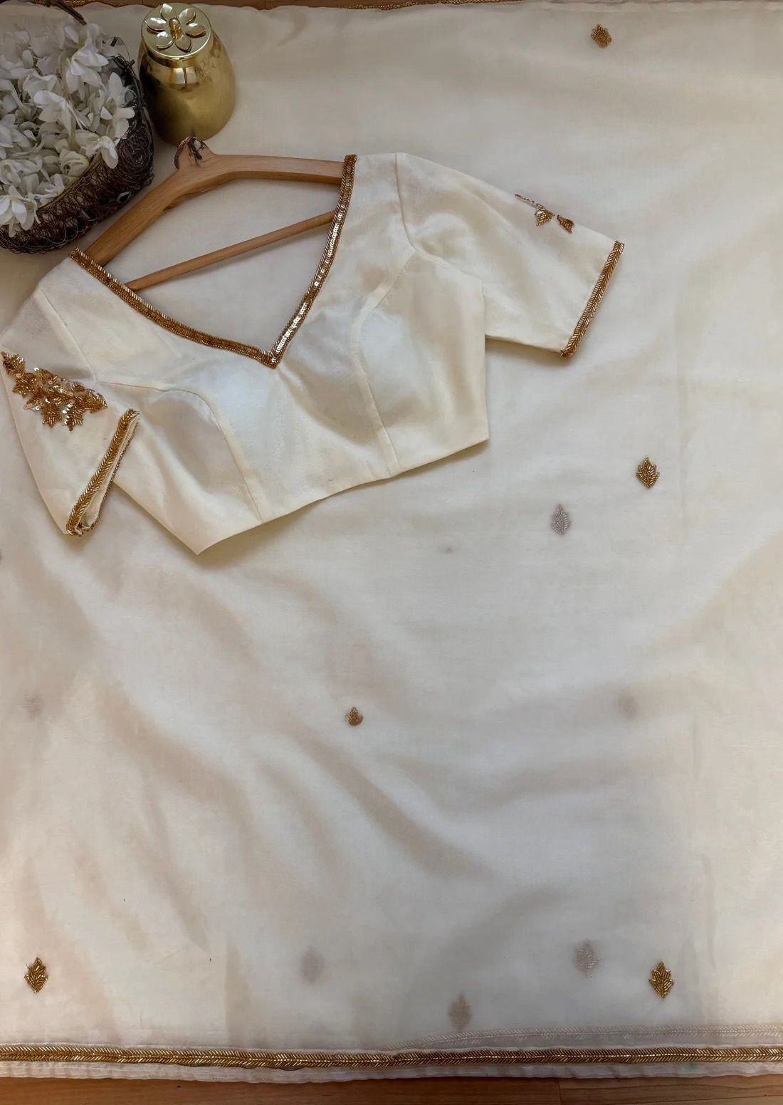 Indulge in luxury with our Divine Ivory Saree. Crafted from organza and adorned with beautiful handwork cutdena butta butti all over, this off white saree exudes elegance. The heavy handwork border adds a touch of opulence, while the included silk handwork blouse completes the look. Perfect for any occasion.