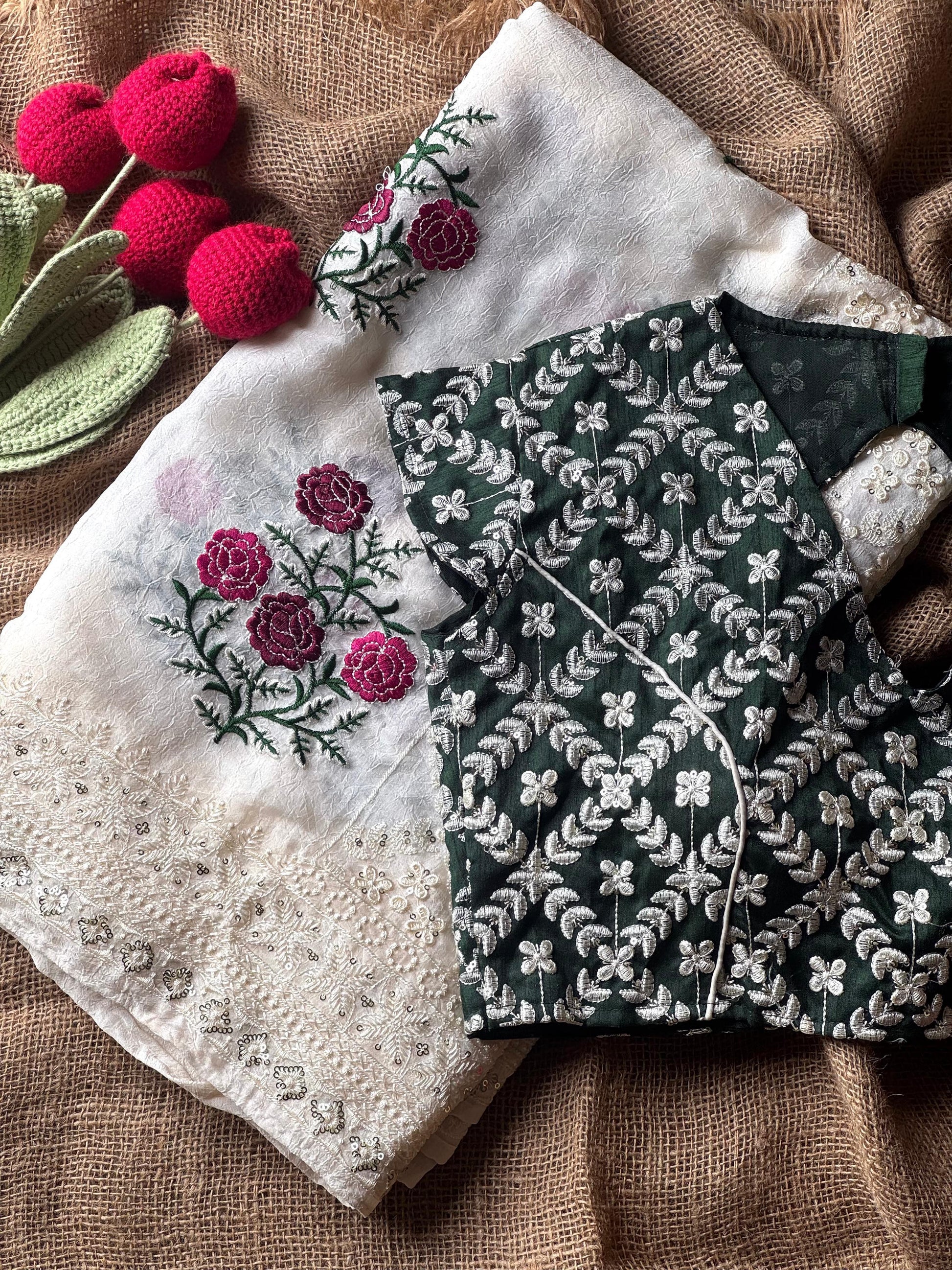 Introducing our latest arrival, the Emerald Charm Drape. Handcrafted with pure chiffon paper crush, this saree features exquisite multi thread embroidery and chikankari work, evoking a sense of luxury and sophistication. The intricate work extends to the blouse, completing the elegant look. Don't miss out on this exclusive and premium piece. ๐