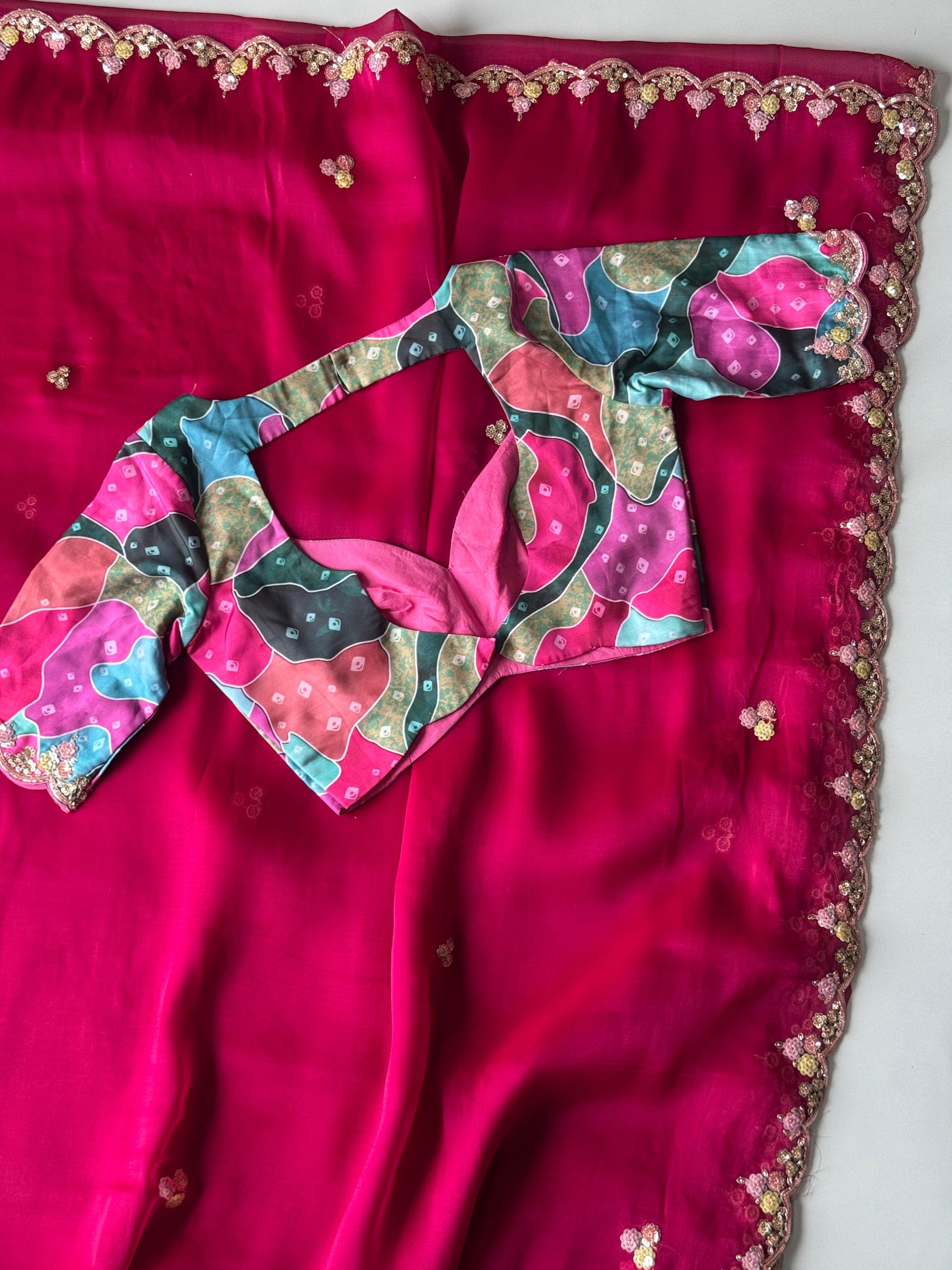 Introducing the Fuchsia Dream Drape, a premium tissue silk saree adorned with exquisite coding and multi-colored sequence work. The delicate scalloped coding and sequence work on either side add a touch of sophistication. Complete the luxurious look with the designer contrast satin print blouse, fully adorned with multi-colored sequence work.