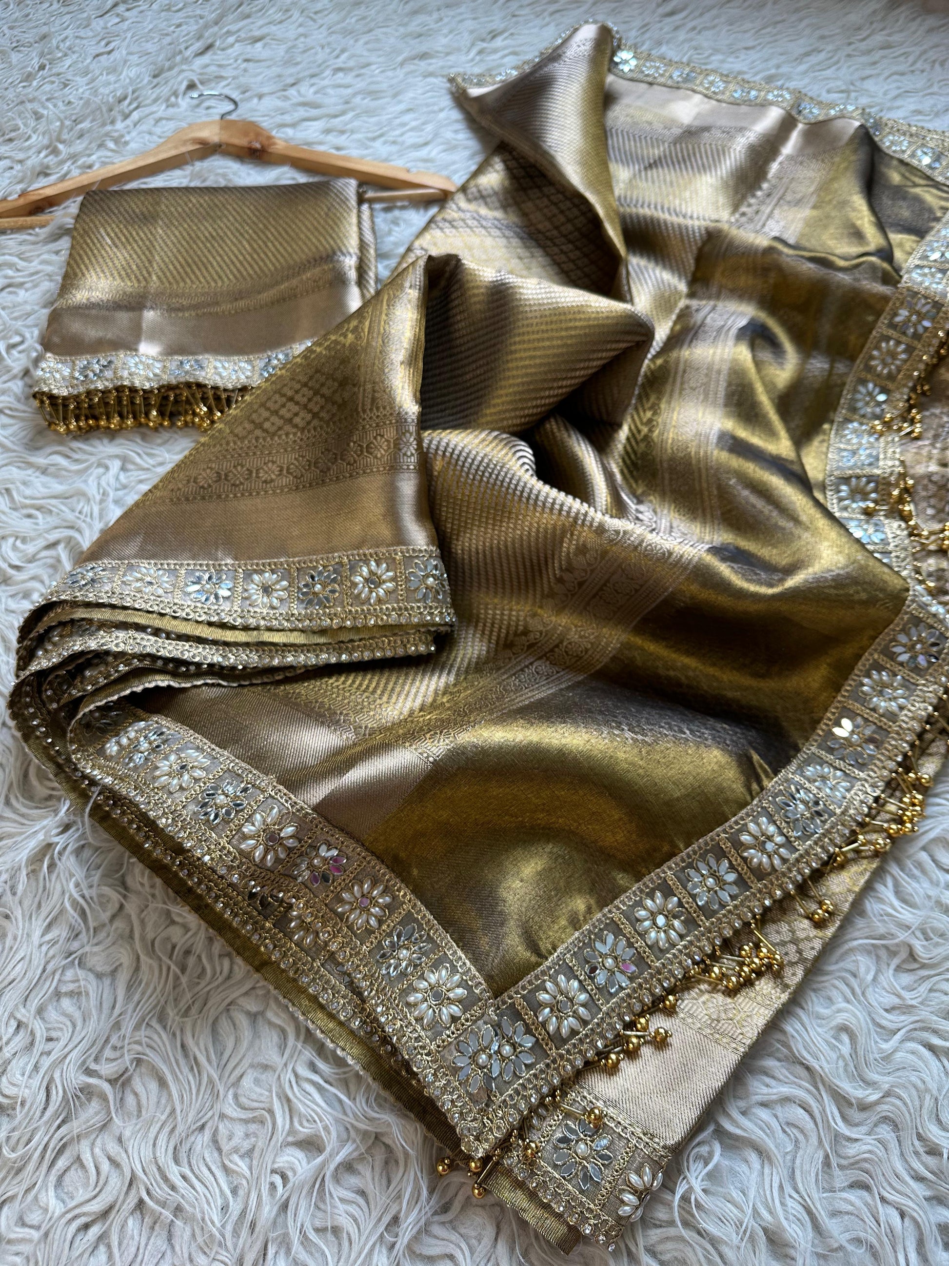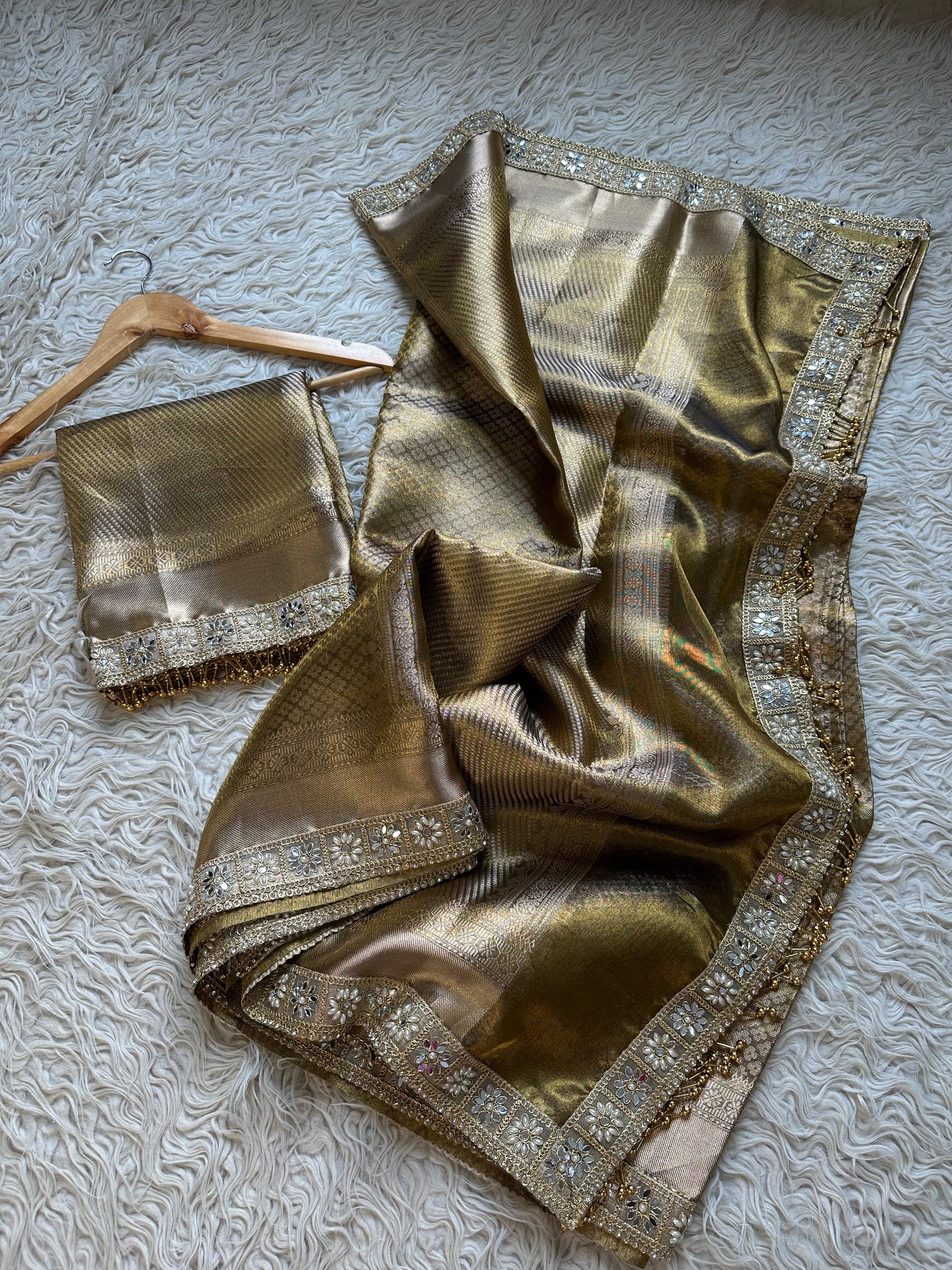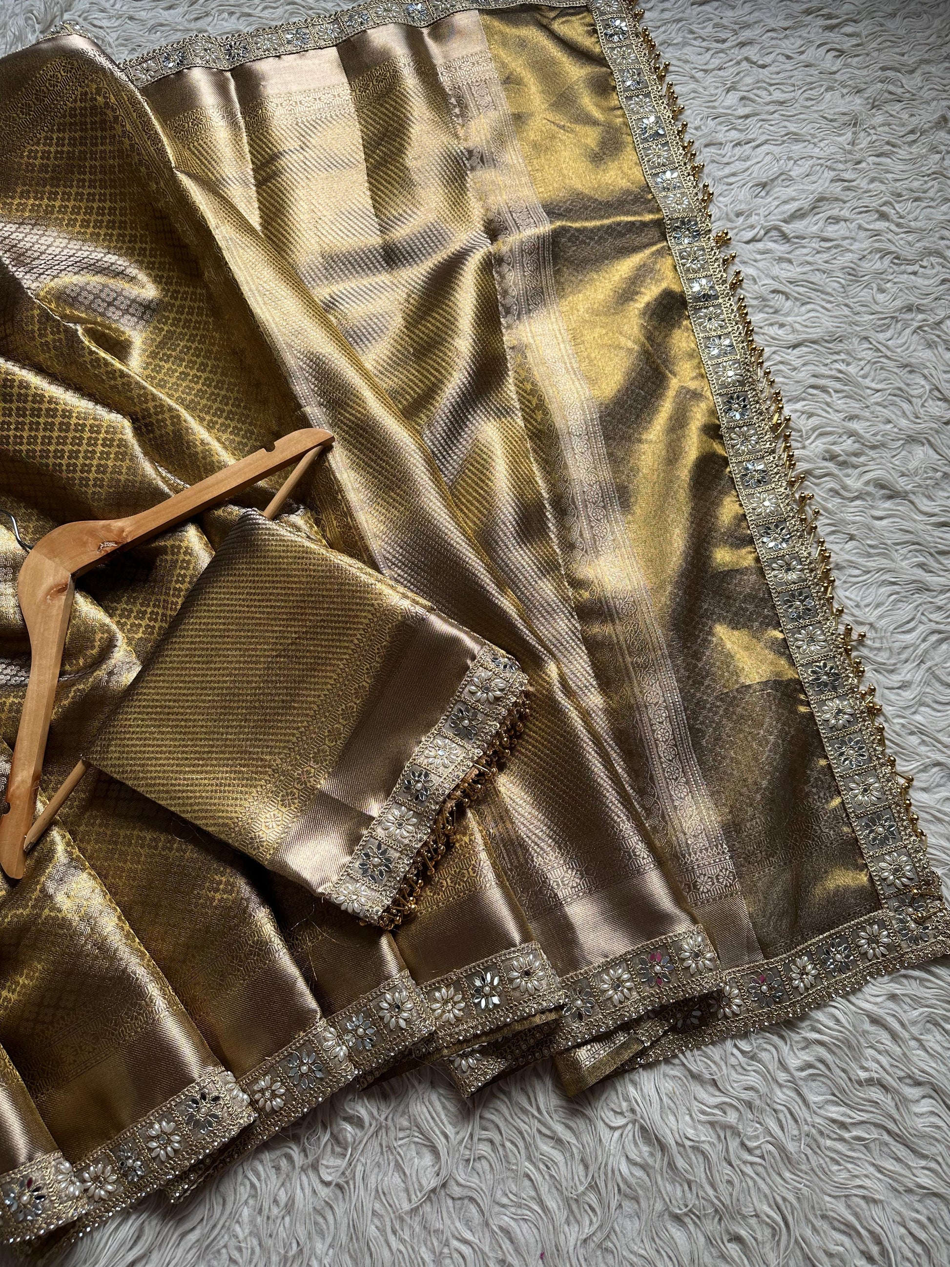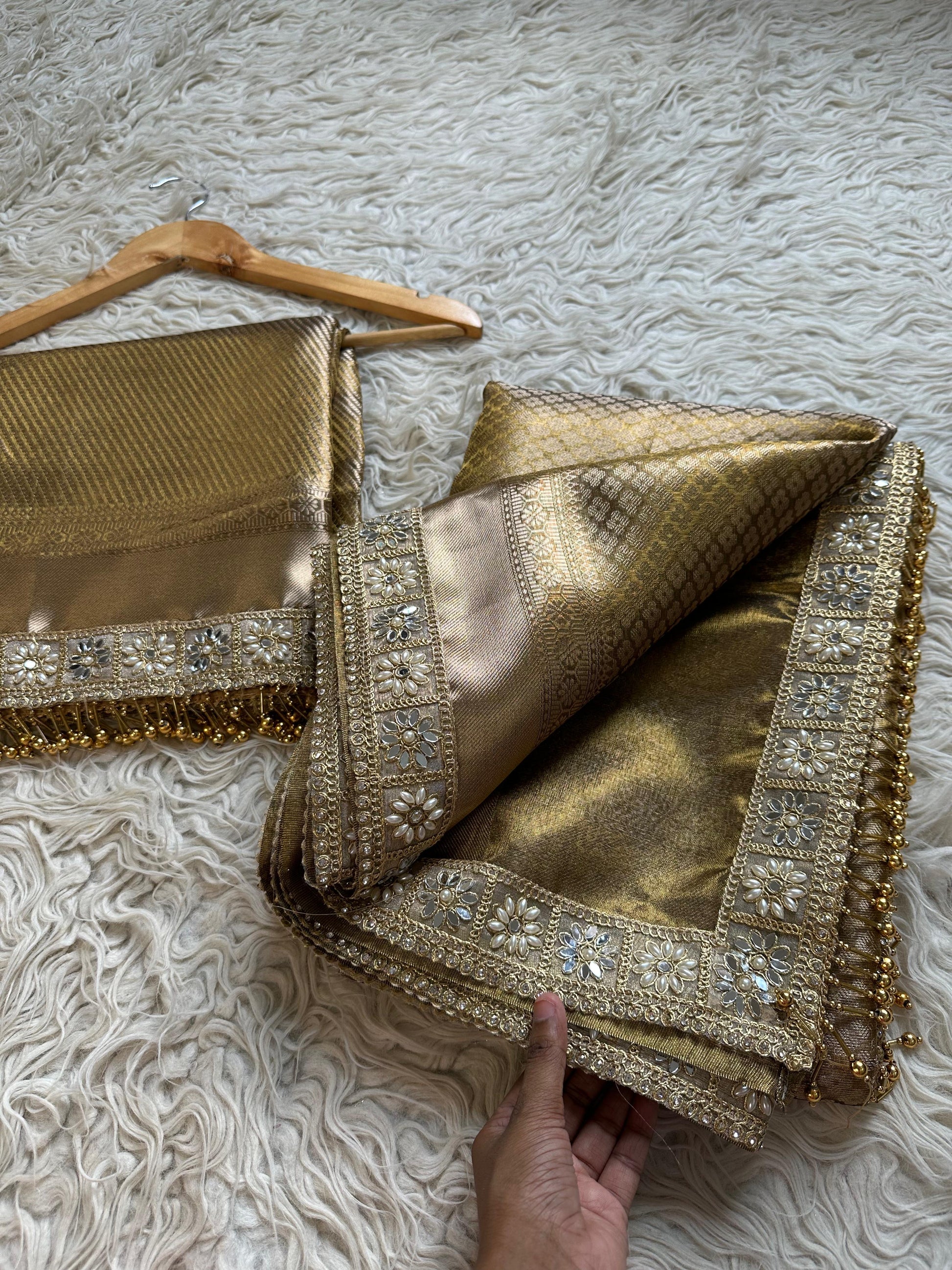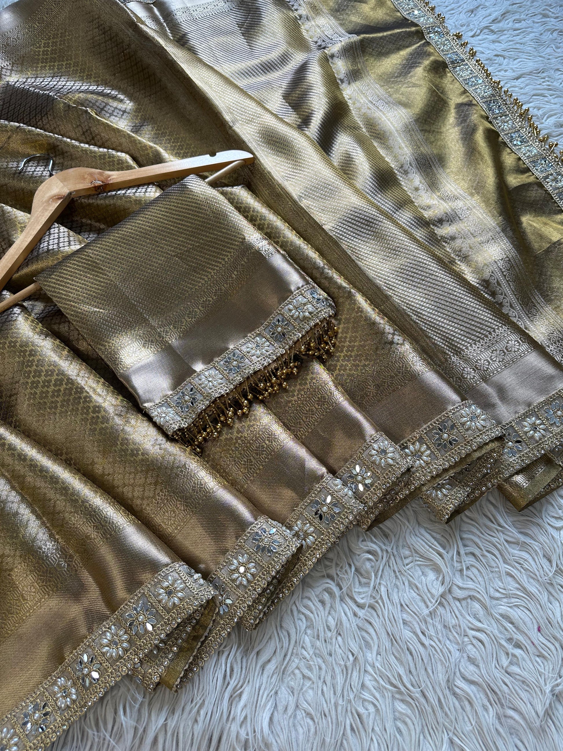 Indulge in luxury and elegance with our Golden Aura Saree. Handcrafted with premium kanjivaram silk, this saree features intricate gold Zari weaving and a beautiful check brocade body. The rich lace attached pallu adds a touch of sophistication, while the included blouse piece boasts a lace jaquerd design. Beware of replicas - accept nothing but the best.