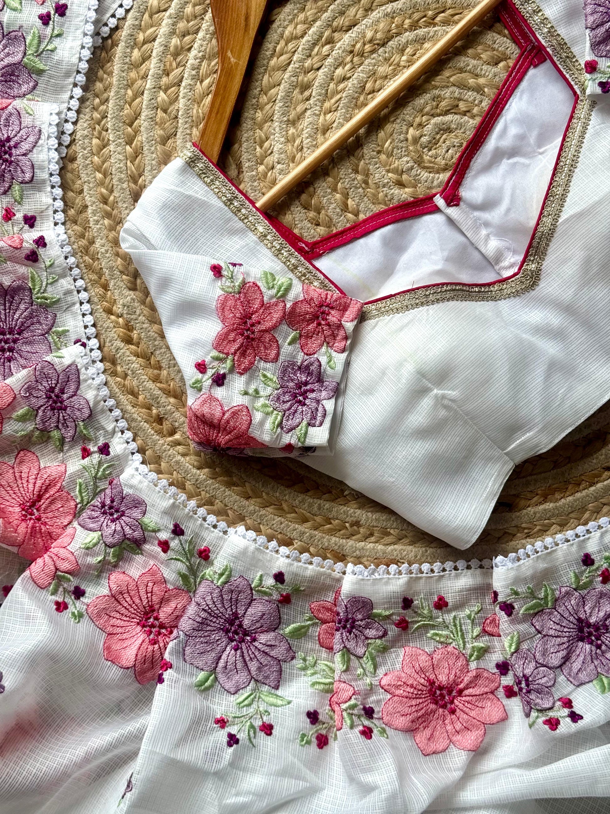 Indulge in elegance with the Gulbahaar Saree. This exclusive launch features a fancy collection, perfect for any occasion. Made with light cotton kota fabric and complete thread work, it offers a luxurious feel. The heavy pure kota saree boasts complete flower work with thread details on the border and palla. The unstitched blouse is also adorned with heavy pure kota work and thread work it's a premium choice.