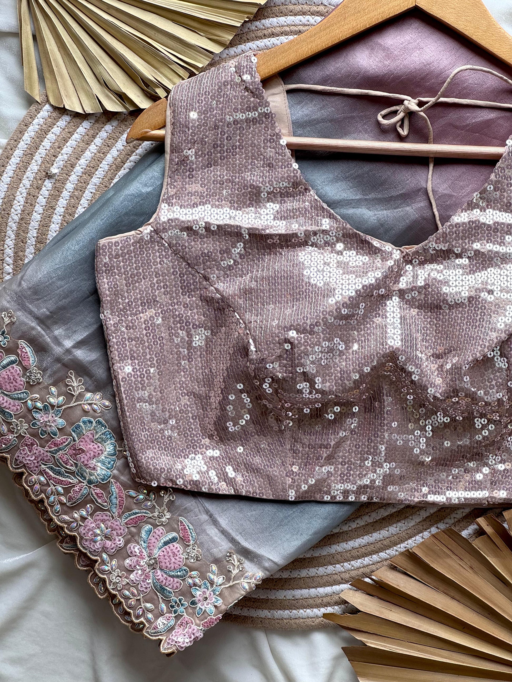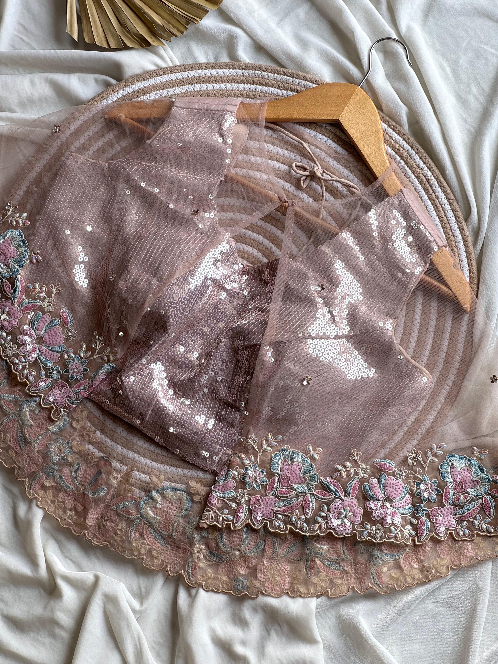 Elevate your wardrobe with our Ishq-e-Pastel Saree. Made with premium space silk and adorned with coding sequence, embroidery, and pearl work, this saree exudes luxury and elegance. The blouse and neck belt feature beautiful frill hands, and the saree itself is ready to wear. Complete the look with the matching hip belt for an exclusive touch.
