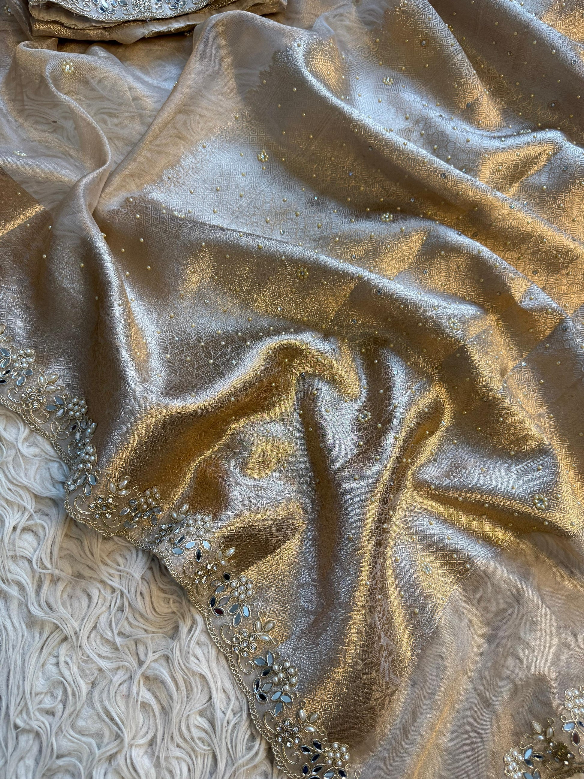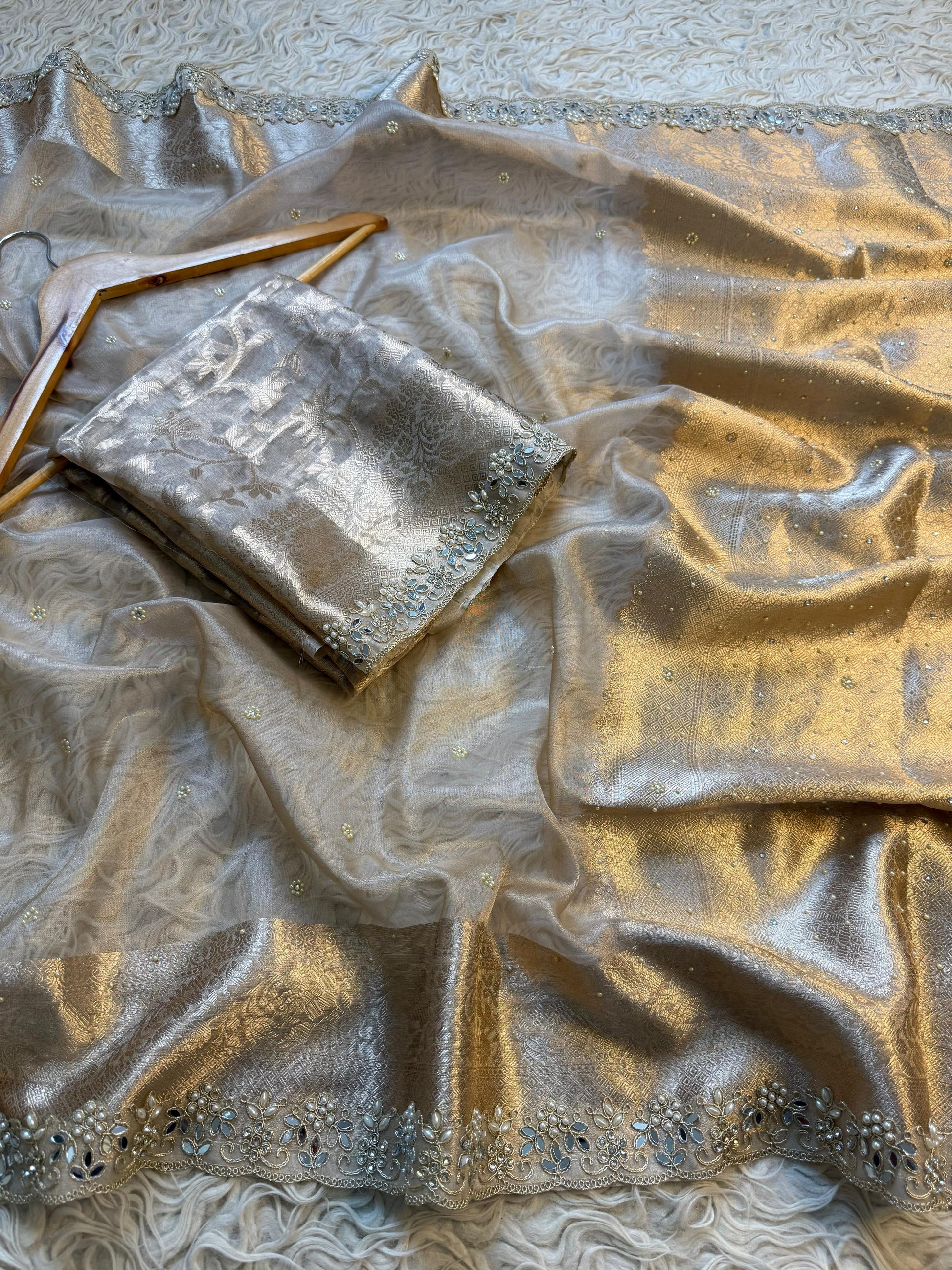 Experience luxury and opulence with our Ivory Luxe Saree. Adorned with *Srivokshi work* and Banarasi maharani tissue, this saree exudes elegance. The gold lace border with stone work adds a touch of royalty, while the plain body and jaquerd jhalar pallu are adorned with exquisite stone work. Complete the look with the diamond lace border blouse piece. Premium quality at its finest.