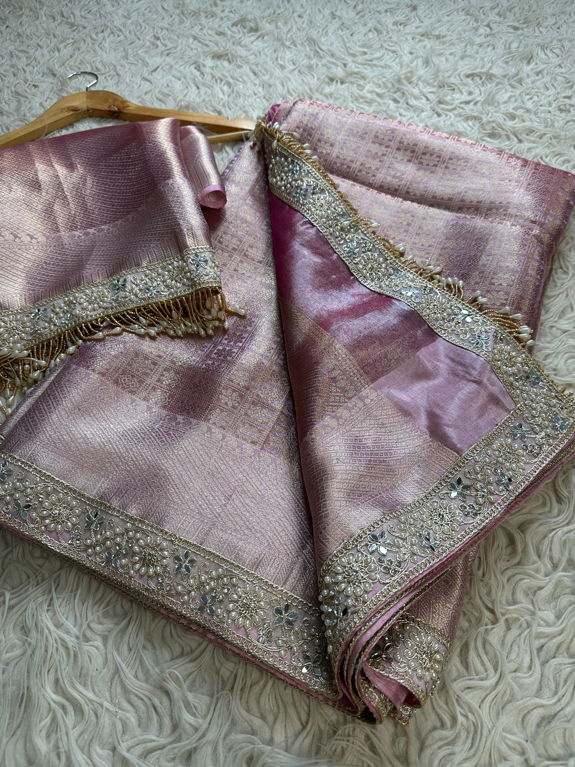 Indulge in luxury with our Komolika Kanjivaram saree. Made from premium kanjivaram silk, this saree features a stunning gold zari weaving border and a beautiful check brocade body. The rich lace jhalar pallu adds a touch of elegance, and it comes with a premium quality jacquard design blouse piece. Beware of replicas.