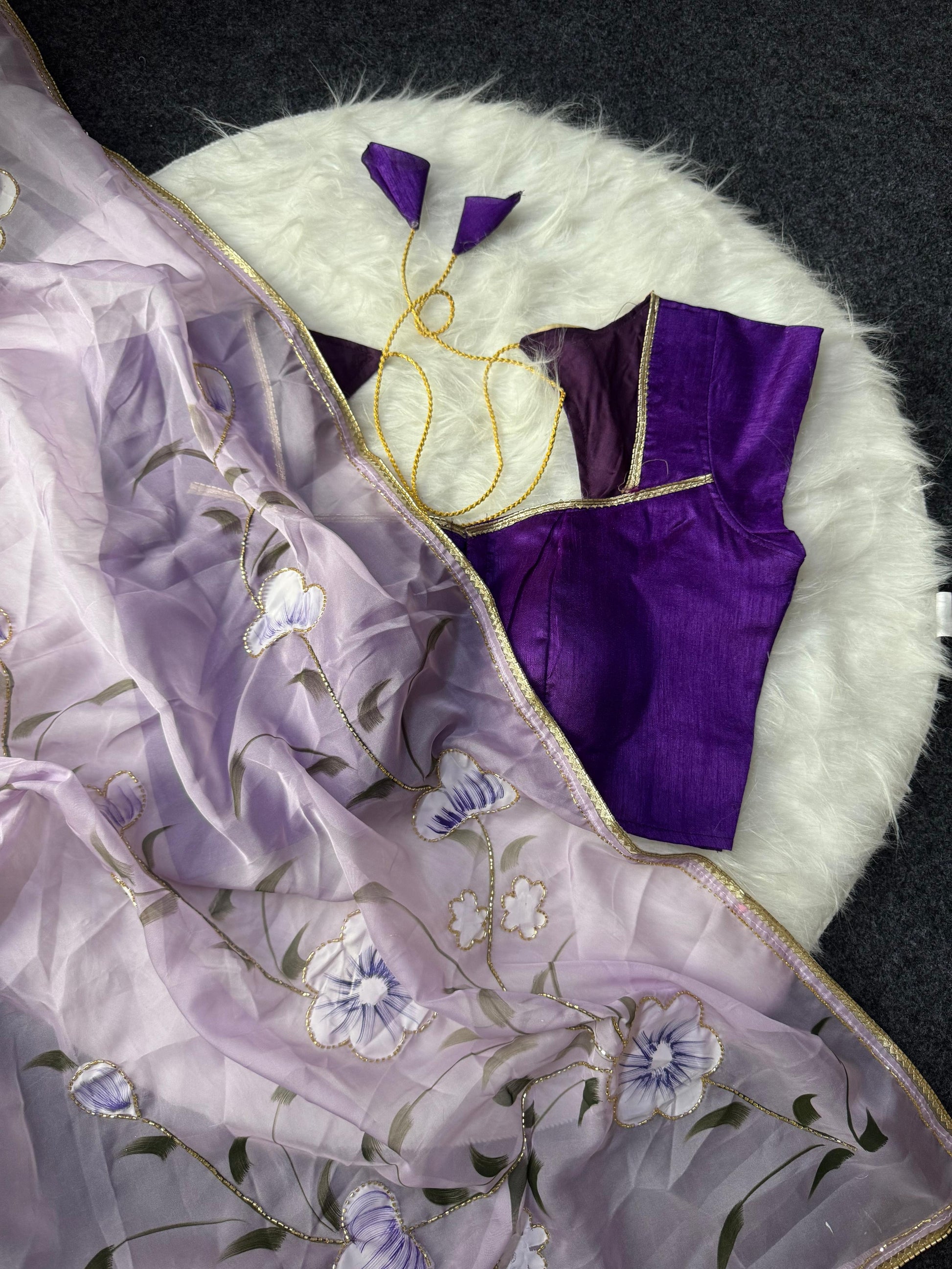 Experience sophistication and grace with our Lilly Bloom Saree. Its soft tebby organza fabric makes it lightweight and easy to carry while the beautiful hand brush paint and cut dana hand work add a touch of elegance. Complete with a contrast banglori fabric blouse, this saree will elevate your style effortlessly.