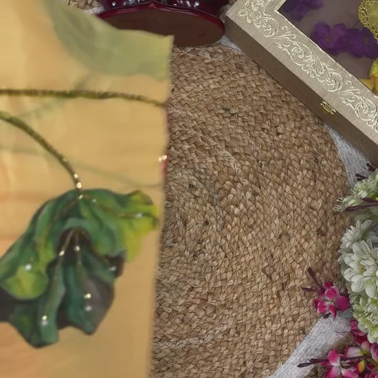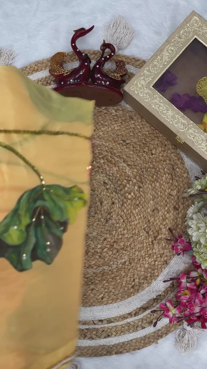 Indulge in luxury with our Meredith Handwork Saree. Made with soft Tabi Silk, this saree features intricate floral print and handwork with beads and katdana in the border and blouse. Elevate your style with this exquisite piece, featuring delicate flower and cutdana handwork.