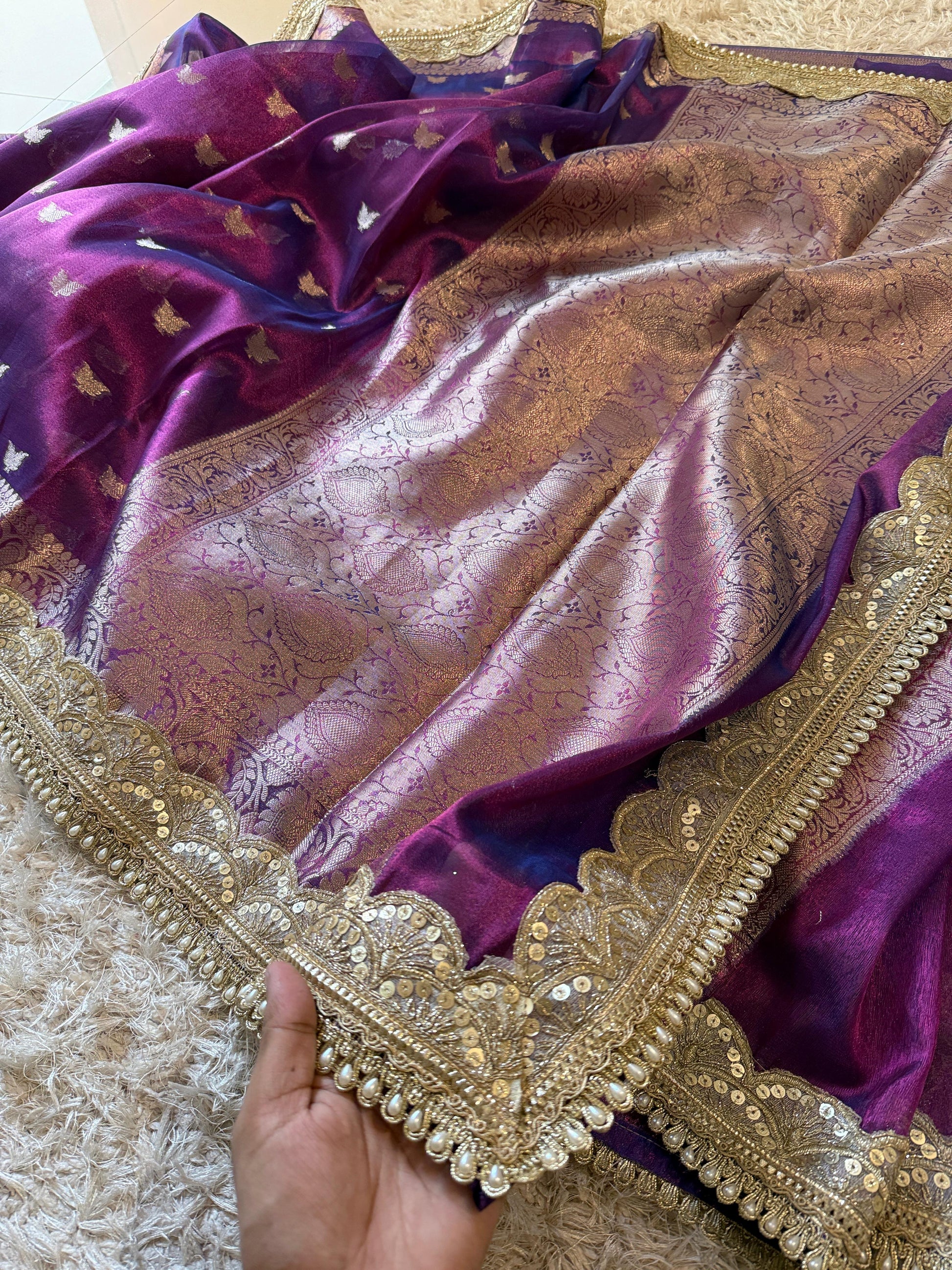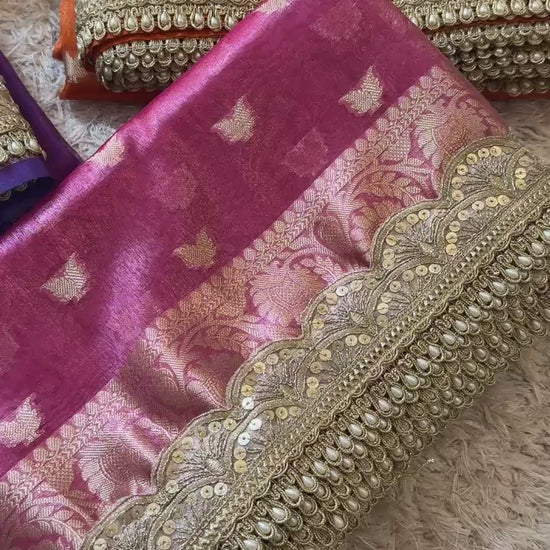 Indulge in luxury with our Noor-e-Banaras Saree in Pink. This Banarasi saree features delicate Glass Tissue Booti Weaving and a stunning Leheriya pattern with Pearls lace work border. The plain blouse with lace work adds a touch of elegance. Customizable in any color. Dispatch time: 3-4 days.