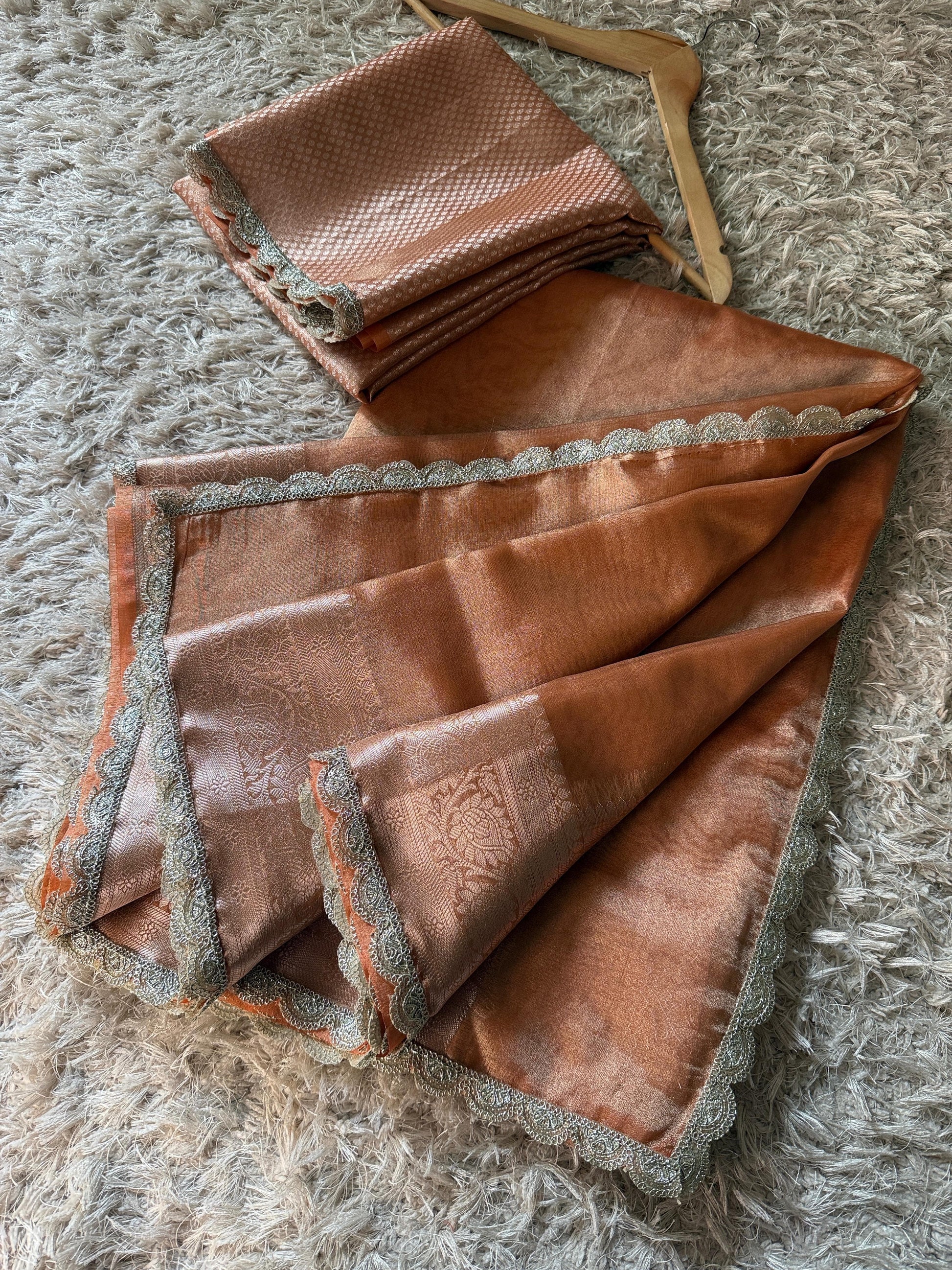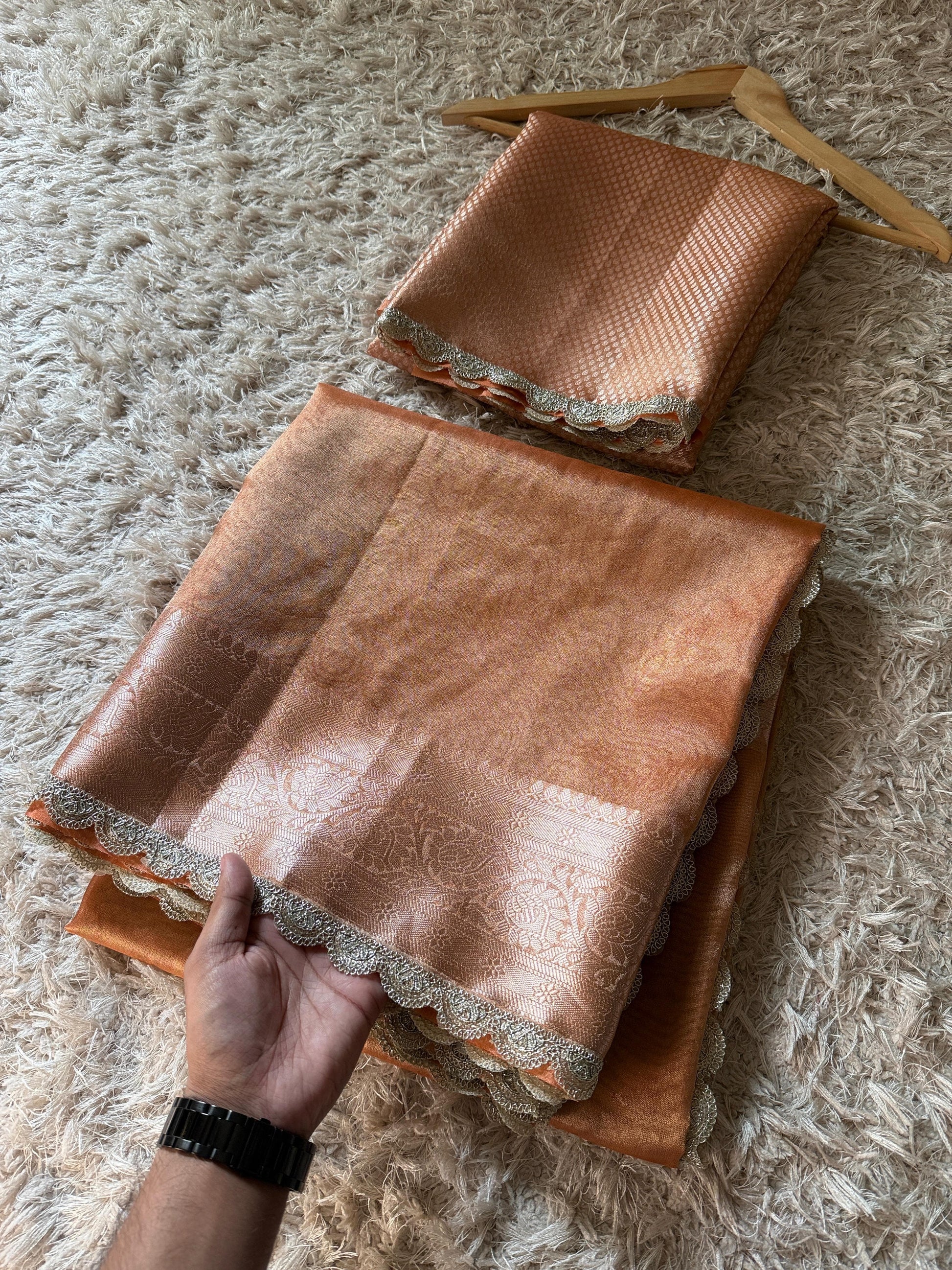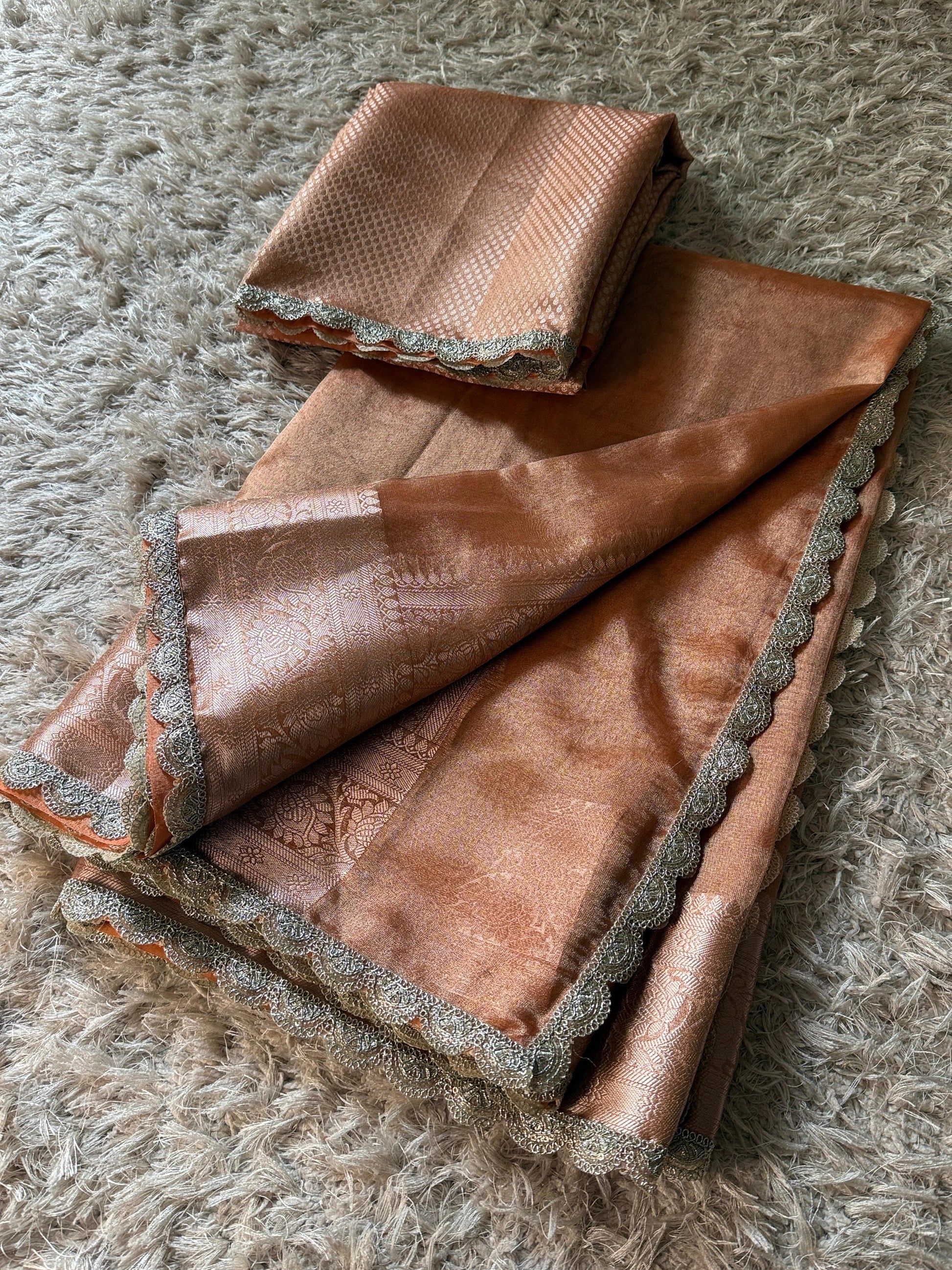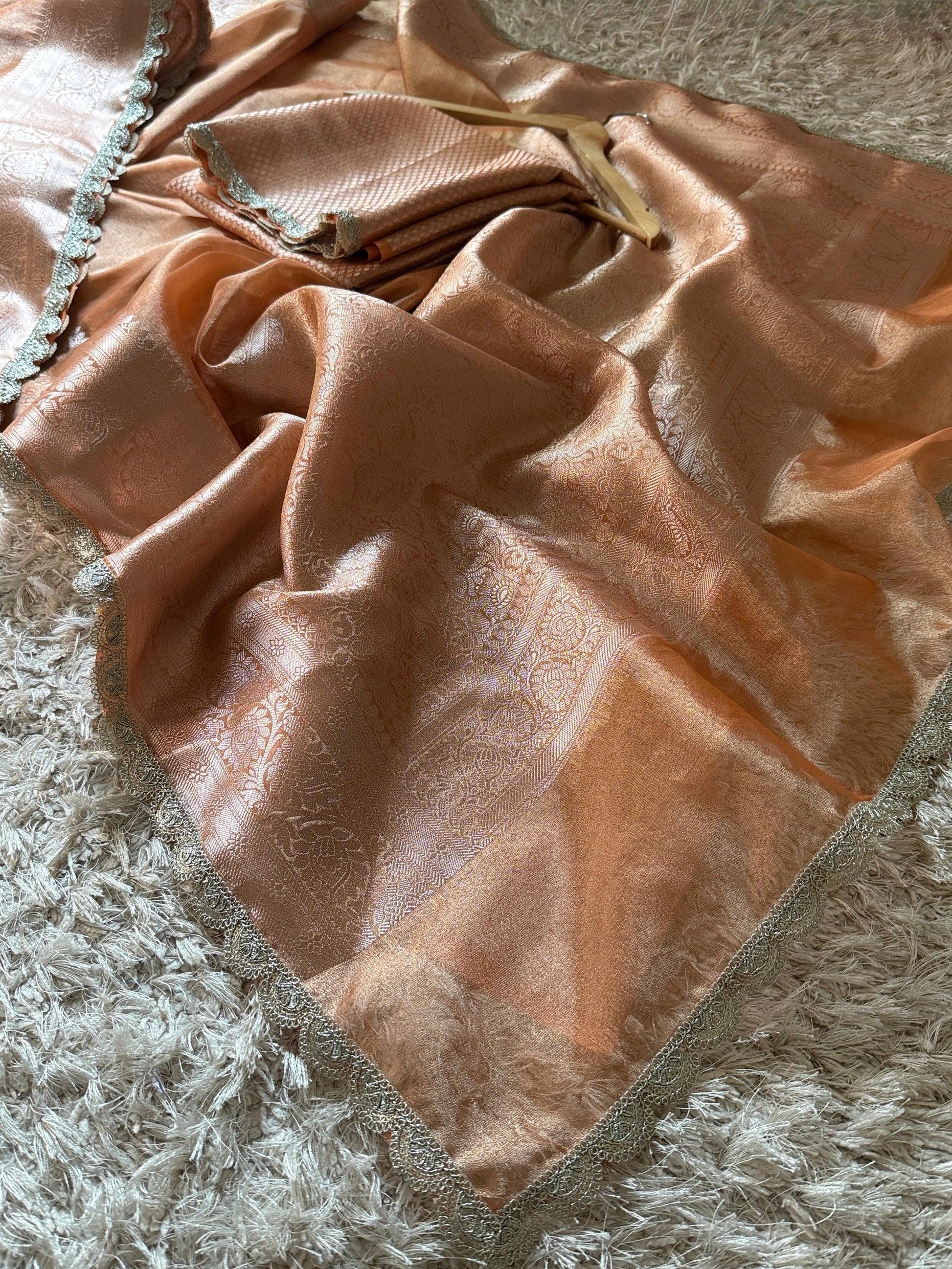The Peach Glow Saree, inspired by Bollywood actress Alia Bhatt, is crafted from premium Banarasi glass tissue silk. This saree features a scallop lace border and a shiny body adorned with intricate zari weaving. Available for both single and bulk orders, it can be customized in any color to suit individual preferences.