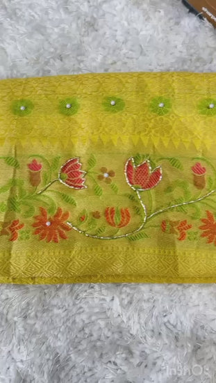 The Roman saree is a stunning semi-pure weaved organza, featuring intricate mina work and heavy hand-crafted detailing. Enjoy an elegant look with intricate designs and mesmerizing weaving blouse with handwork.