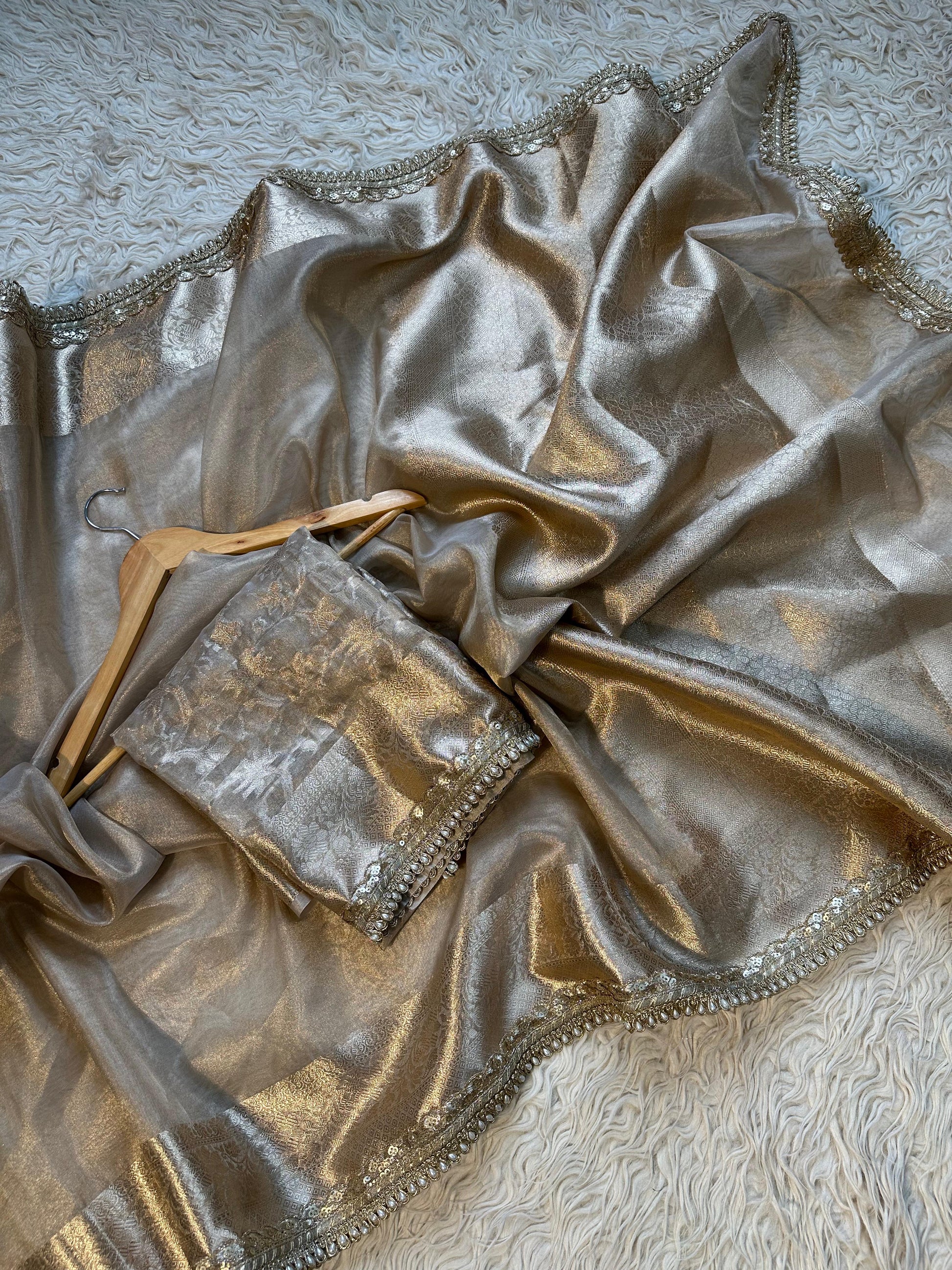 Radiate grace and elegance in our Param Sundari Tissue Saree. Inspired by Janhvi Kapoor, this Banarasi tissue saree features a beautifully attached gold lace border and a rich lace jaquerd pallu. The premium quality and intricate lace detailing on the blouse piece make it an exclusive and luxurious choice. In stock and ready to be dispatched in 3-4 days. 🎁🛍️