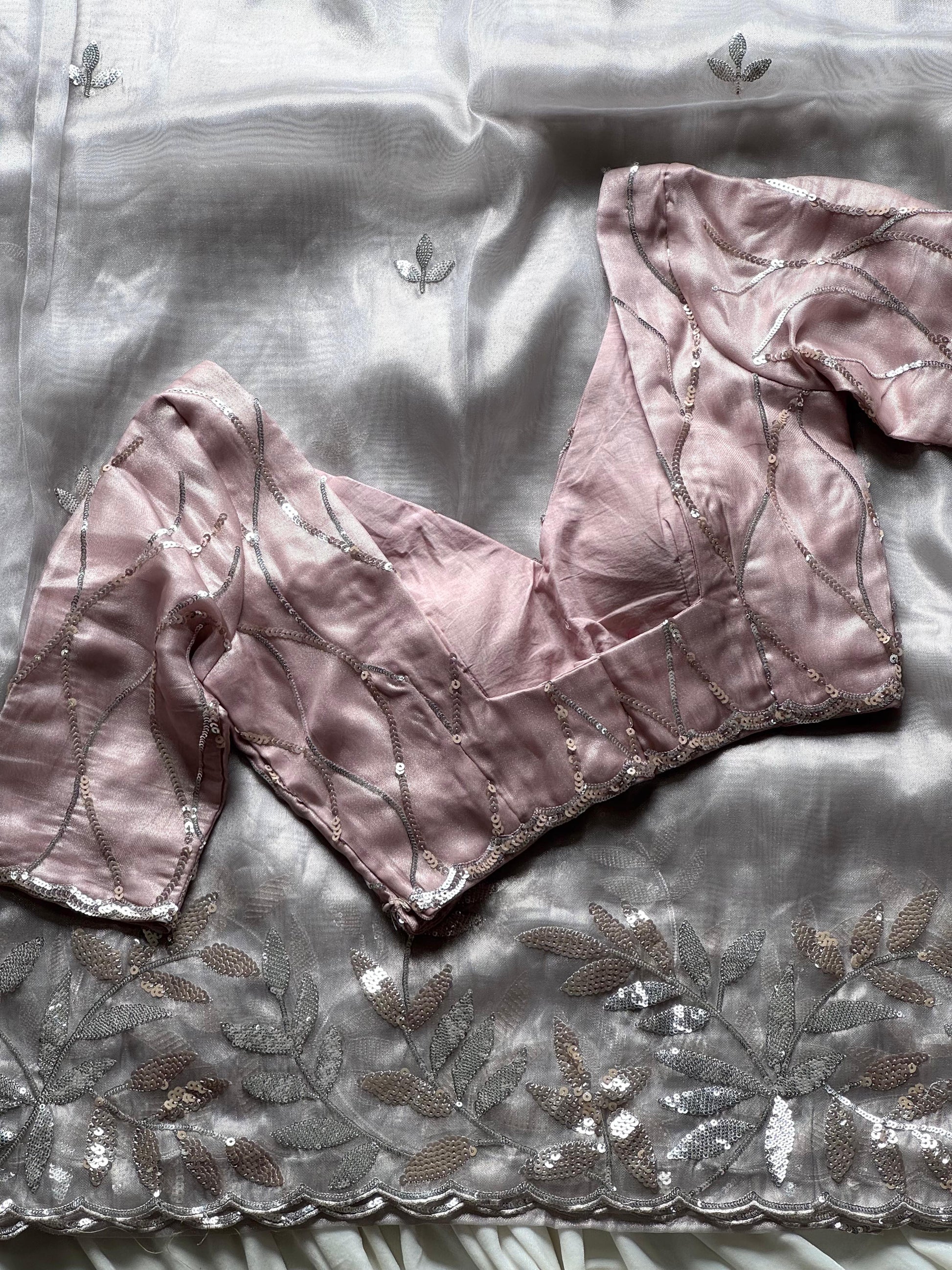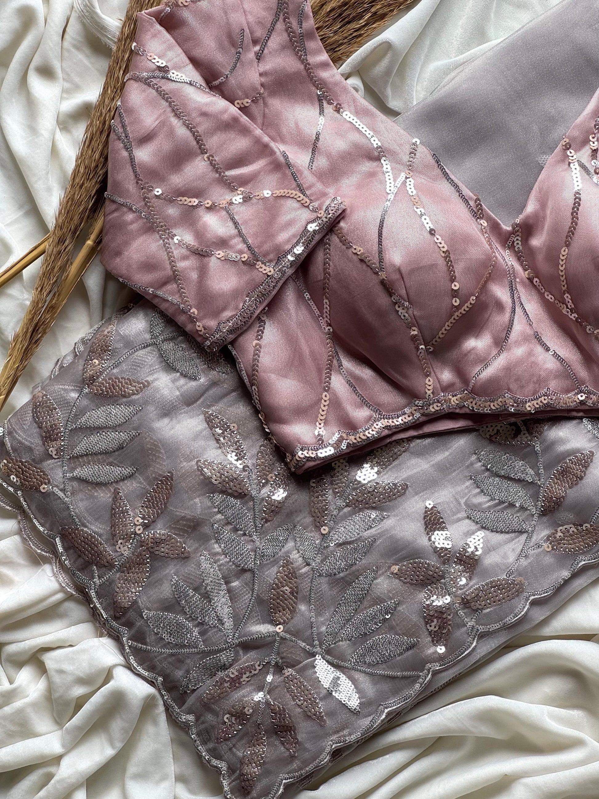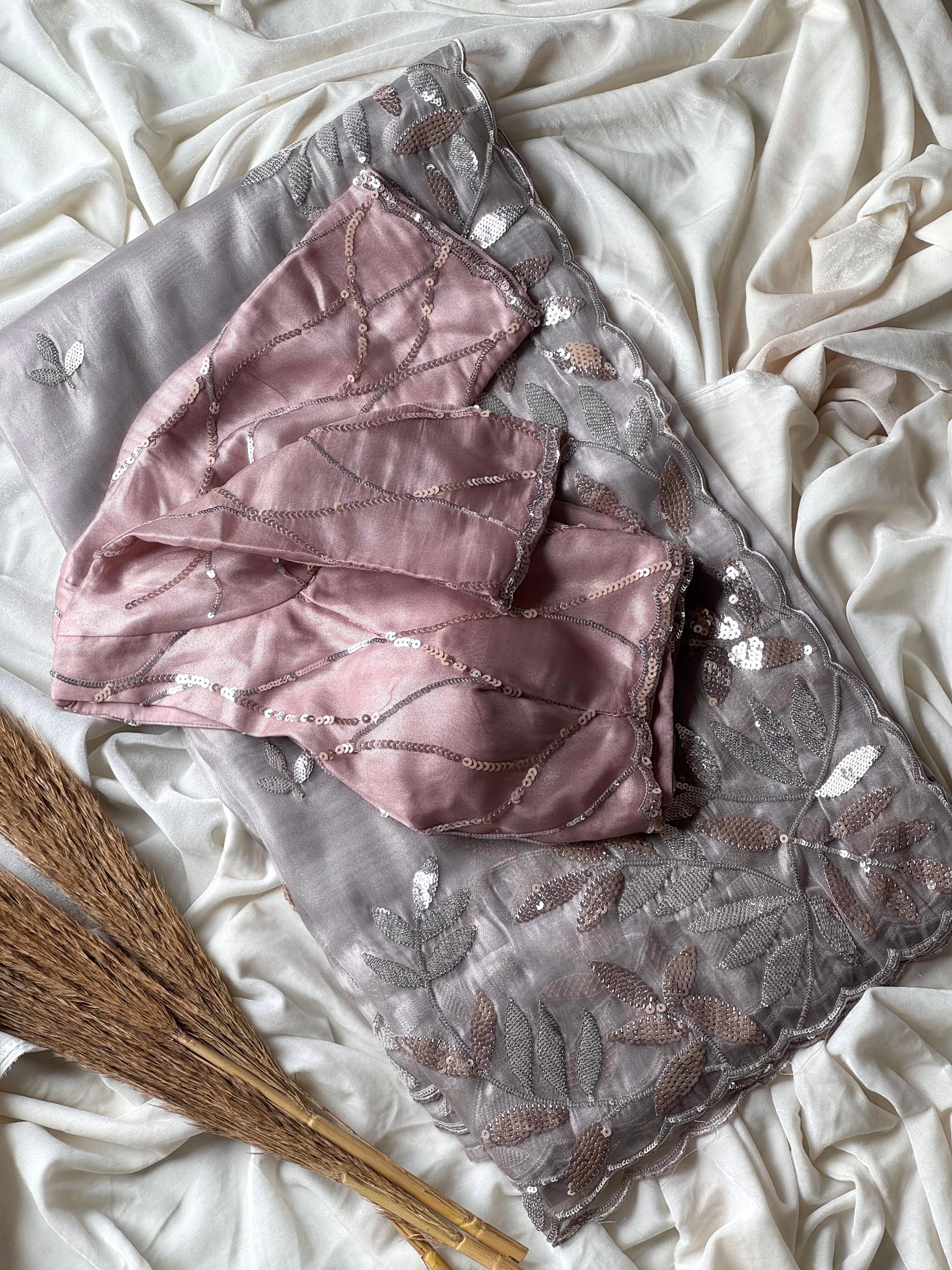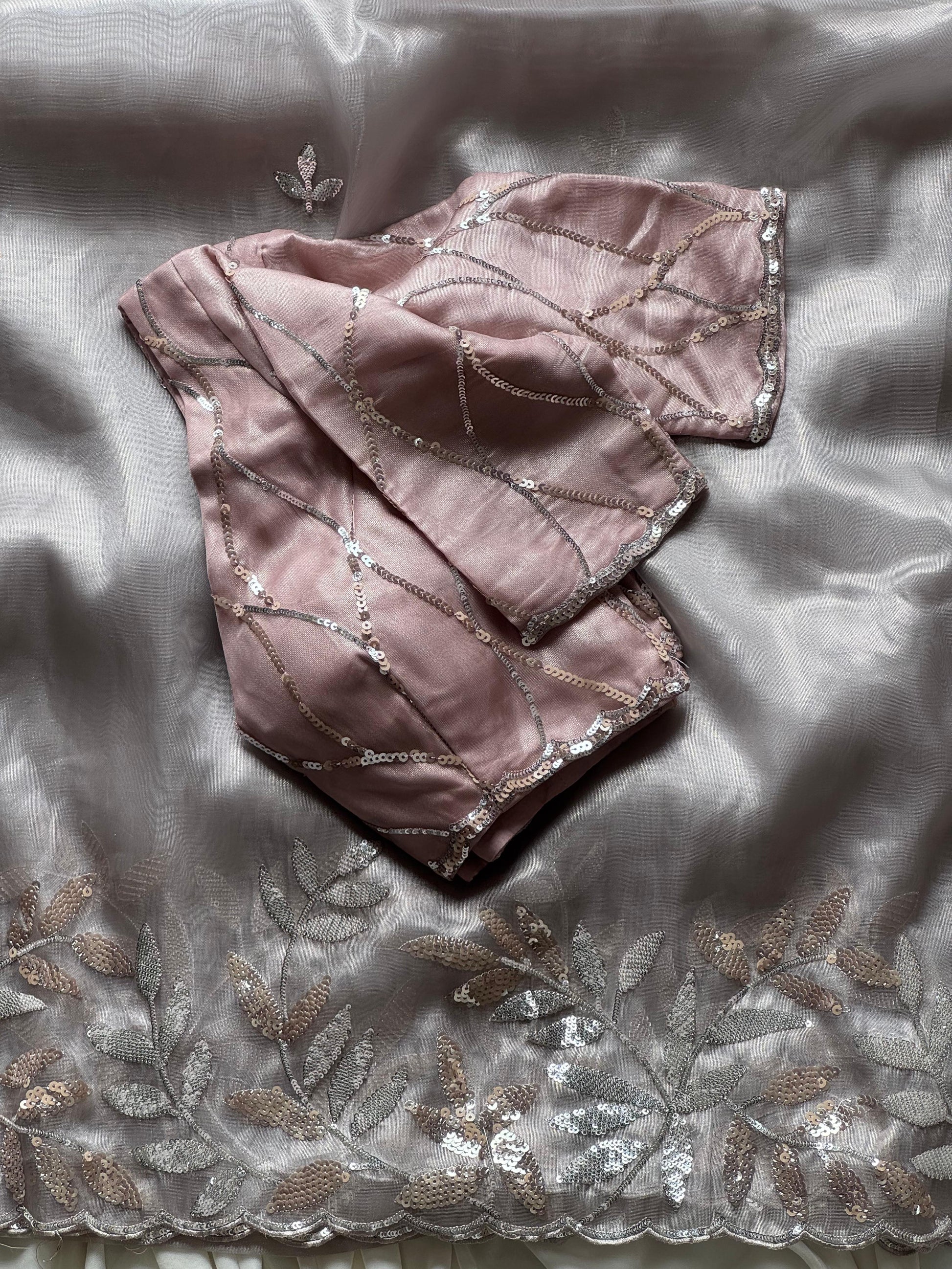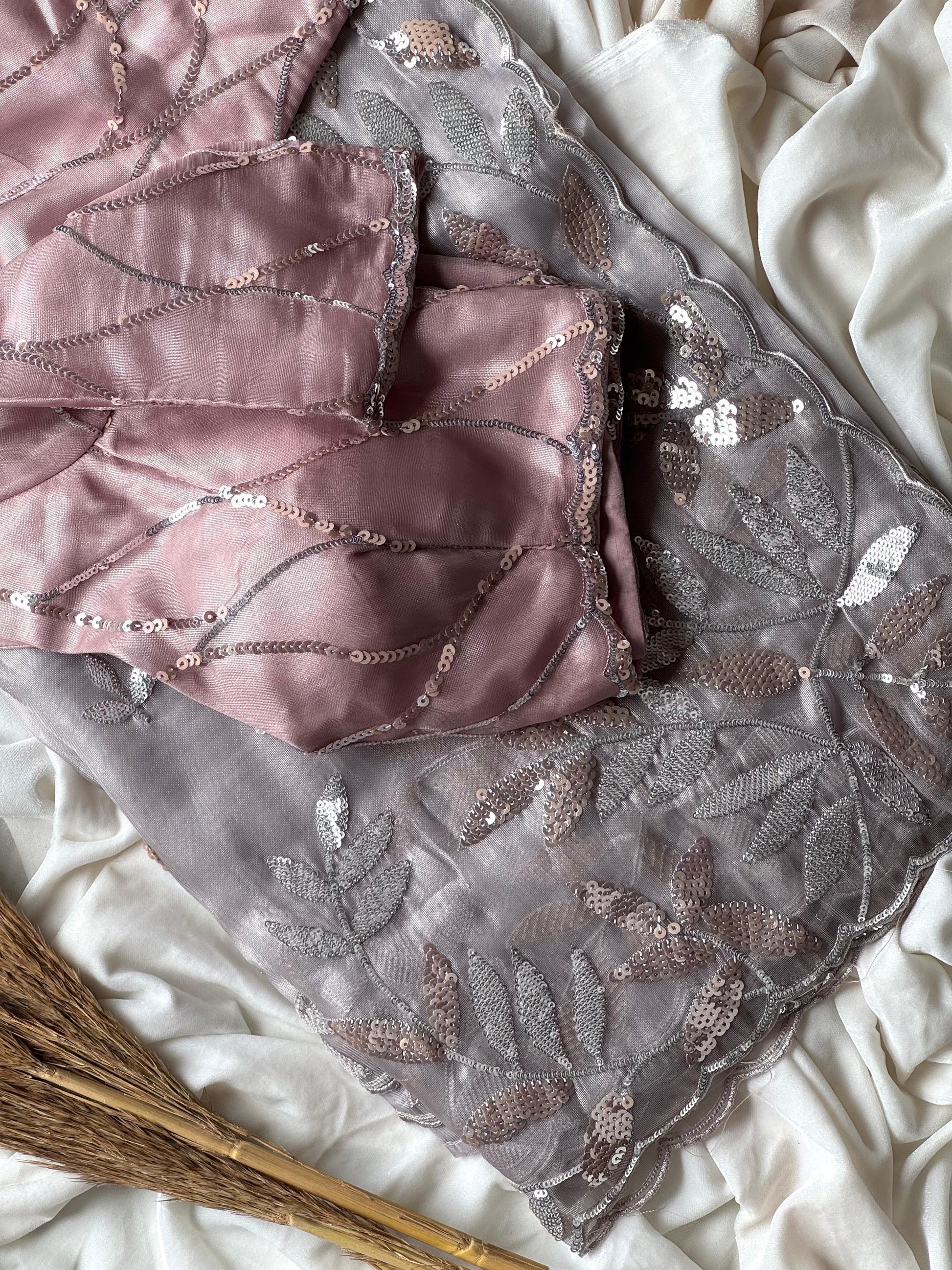 Introducing the Sequined Serenity Luxe Saree, an exclusive and premium arrival. Made from pure Tissue fabric, this saree features stunning sequence leafy work and coding work on either side. Complete with a designer stitched blouse piece, this saree exudes elegance and luxury. Elevate your style with this exquisite piece.