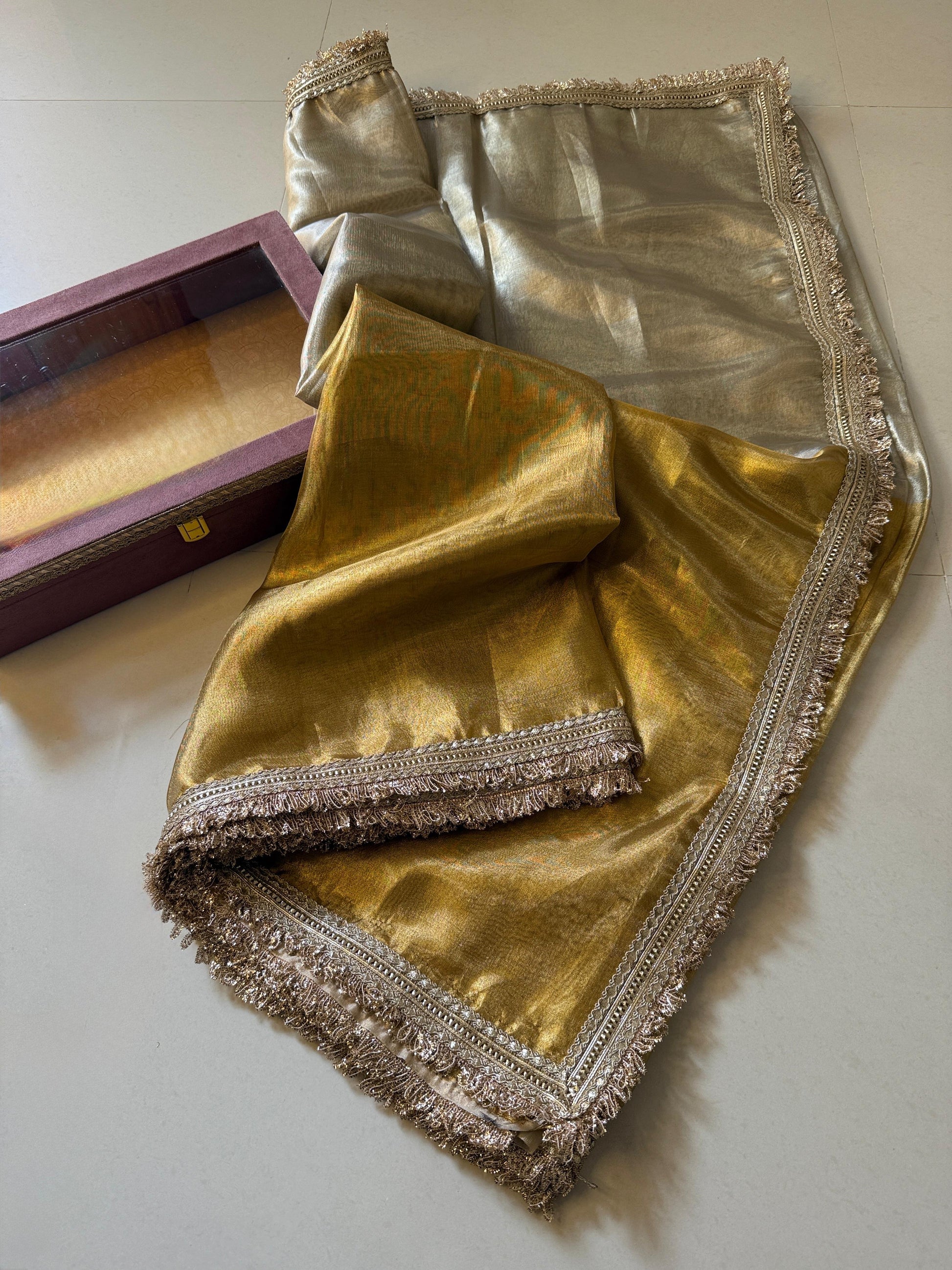 Indulge in luxury with our Serein Drape Saree in Gold. This handloom inspired saree is crafted with a two-tone metallic Banarasi tissue soft silk fabric, adorned with intricate Gotapatti and Uljhan lace work. The super lightweight fabric hugs your body, giving you the feel of pure silk. Available in both Silver and Gold, it is a perfect addition to your wardrobe. Dispatch time: 3-4 days.