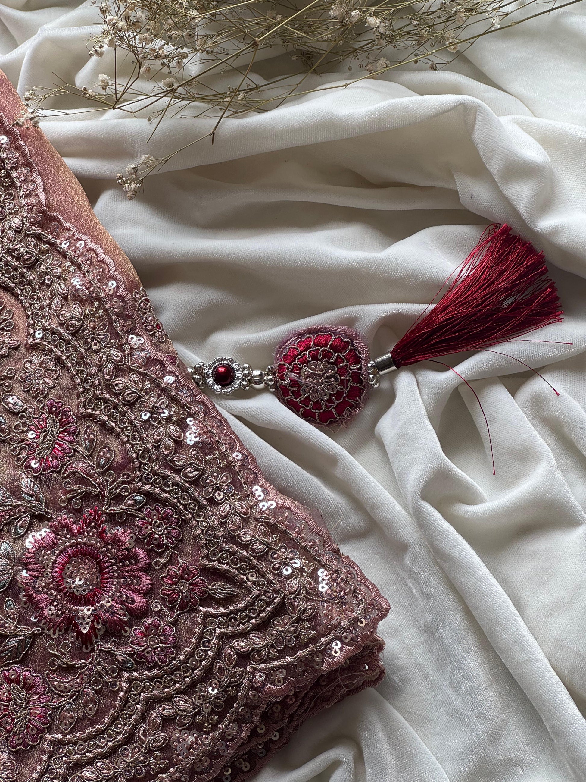 Introducing the Shahi Saaj Luxe Saree, our latest exclusive and premium arrival. Made with premium tissue silk and adorned with delicate coding work and multi-color sequence, this saree exudes luxury. The scalloped coding sequence work on either side and the designer tassels add to its elegance. Complete the look with the designer stitched blouse, fully worked with multi-sequence. Elevate your style with this truly exquisite saree.