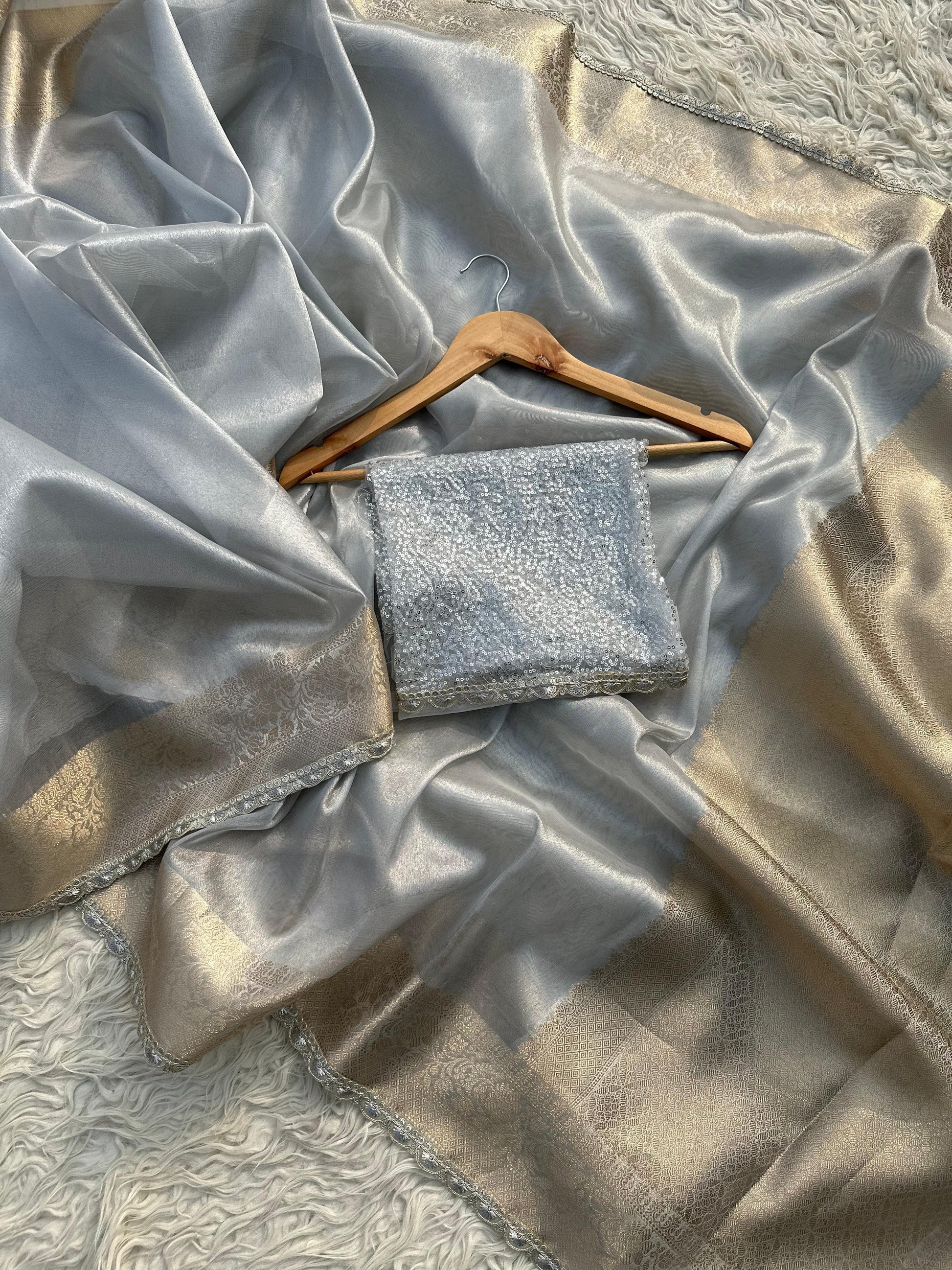 Indulge in luxury with our Silver Glow Saree. Made with premium Banarasi maharani tissue and a rich lace border, this saree exudes elegance and sophistication. The beautiful lace details and tissue body add a touch of romance to this exclusive piece. Complete your look with the included jaquerd blouse piece. Order now and experience the premium quality for yourself. Dispatch time: 4 days.