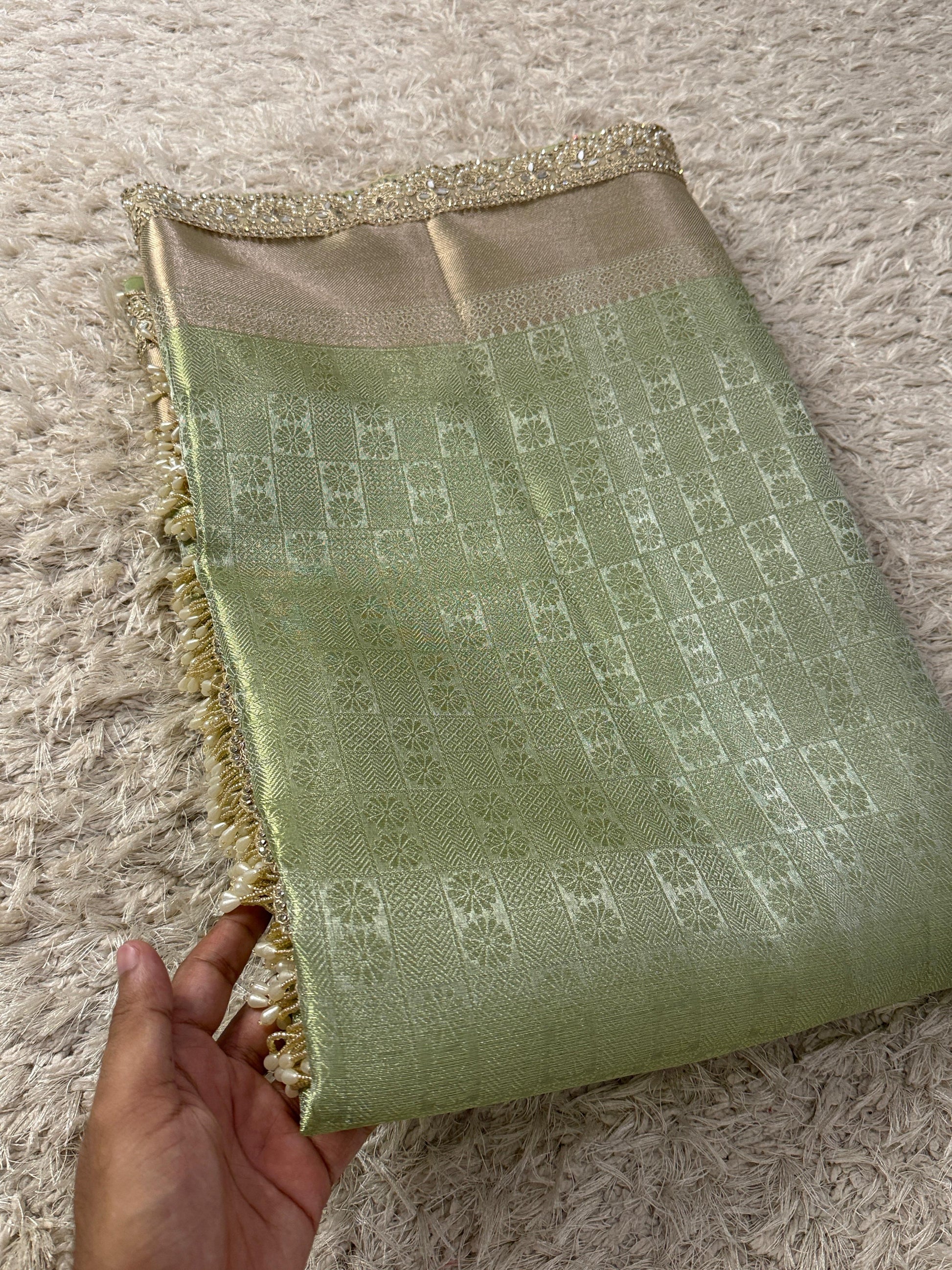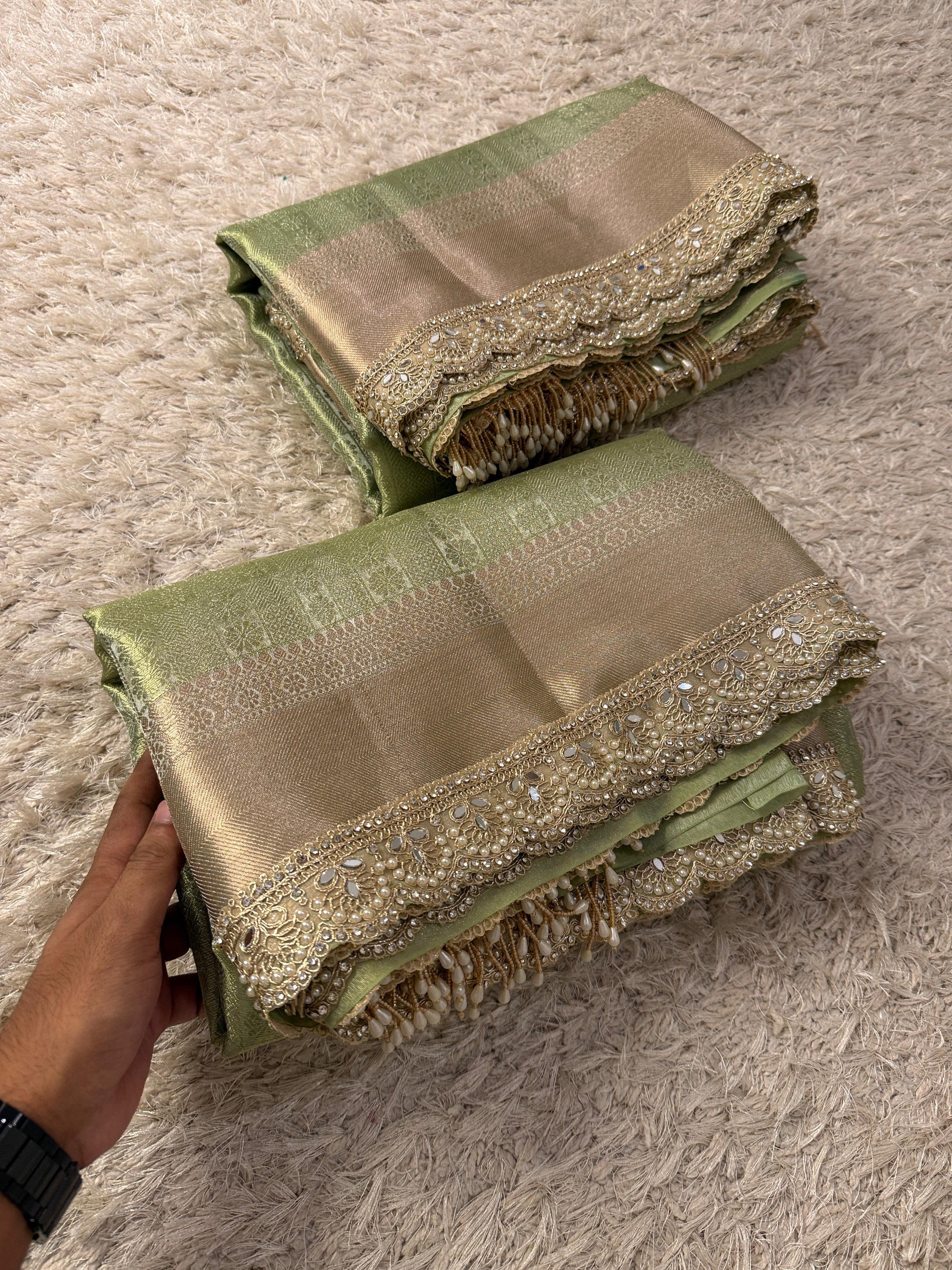 Indulge in luxury with our Zyana Banarasi Tissue Saree. Made from premium Kanjivaram bridal Waskat fabric, it features a hand-attached diamond and pearls lace border, latkan work at the pallu side, and a stunning brocade designer body. Complete with a brocade pallu and blouse piece, this saree exudes elegance and exclusivity. Beware of replicas, only buy from our official sources for authenticity. Dispatch time: 2-4 days.